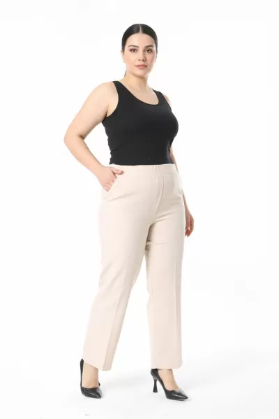 Beli Lastikli Ekru Duble Krep Büyük Beden Kadın Pantolon