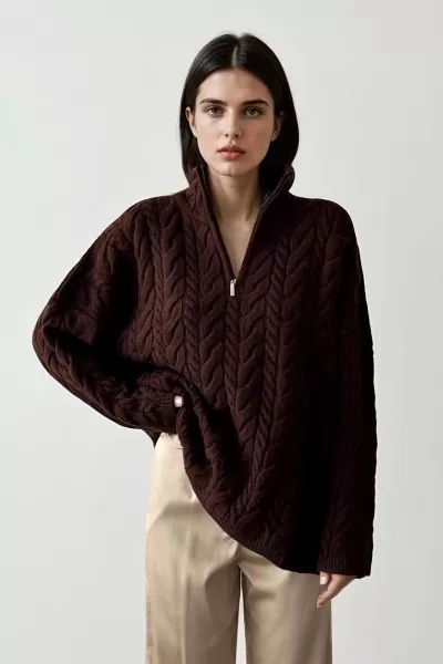 Fermuarlı Kahverengi Triko Kadın Kazak