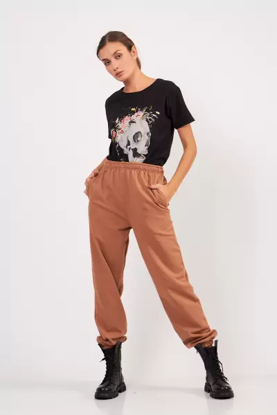 Bej Pamuklu Üç İplik Şardonlu Kadın Eşofman Altı