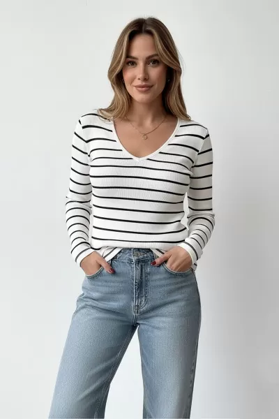 Ekru Siyah Zebra Desenli Triko Kadın Kazak