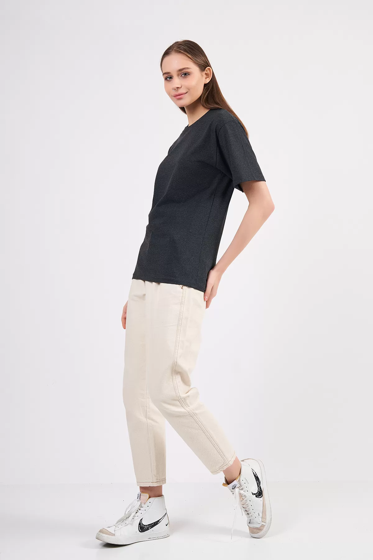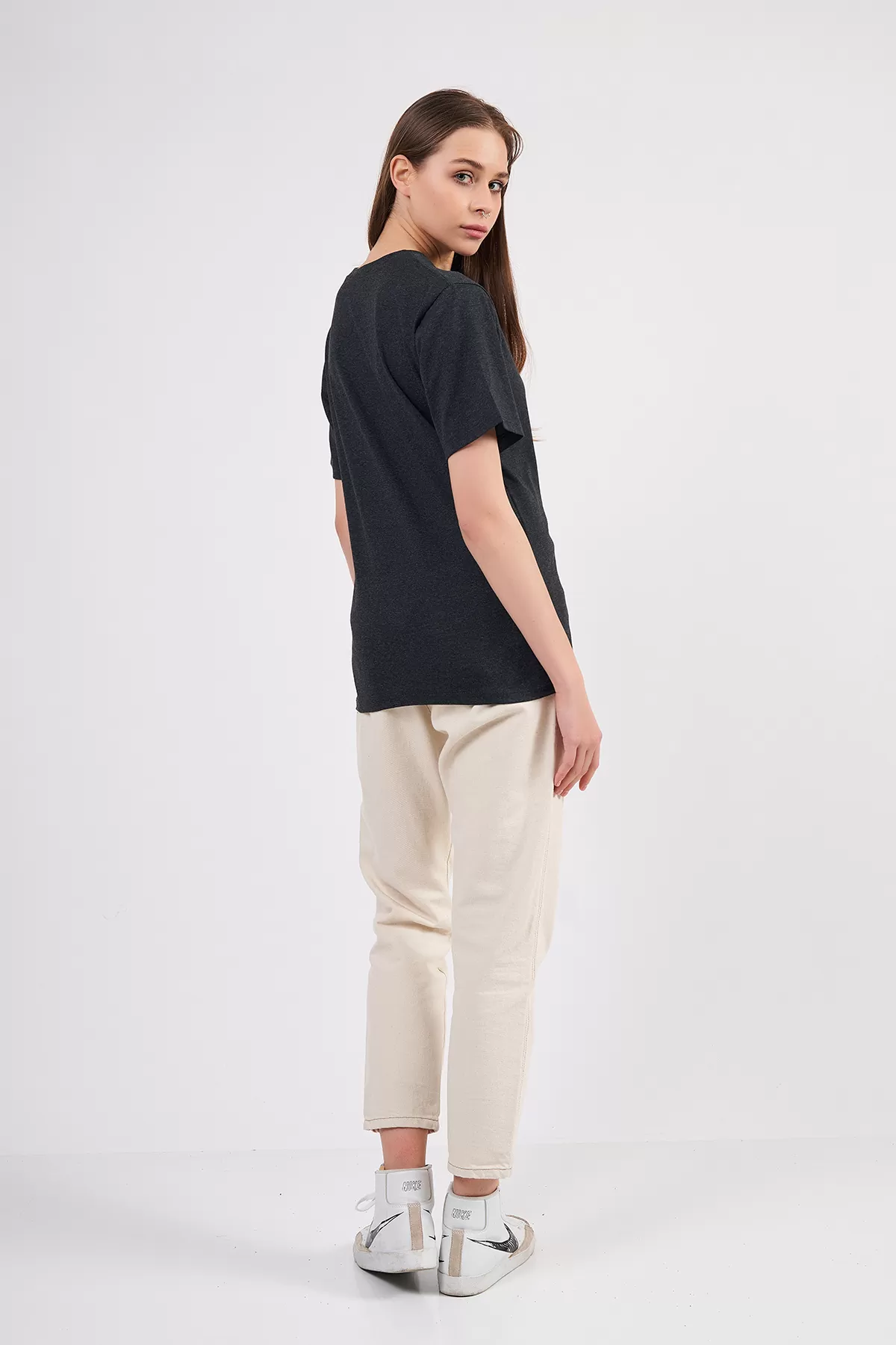 Antrasit Pamuklu Basic Kadın T-Shirt