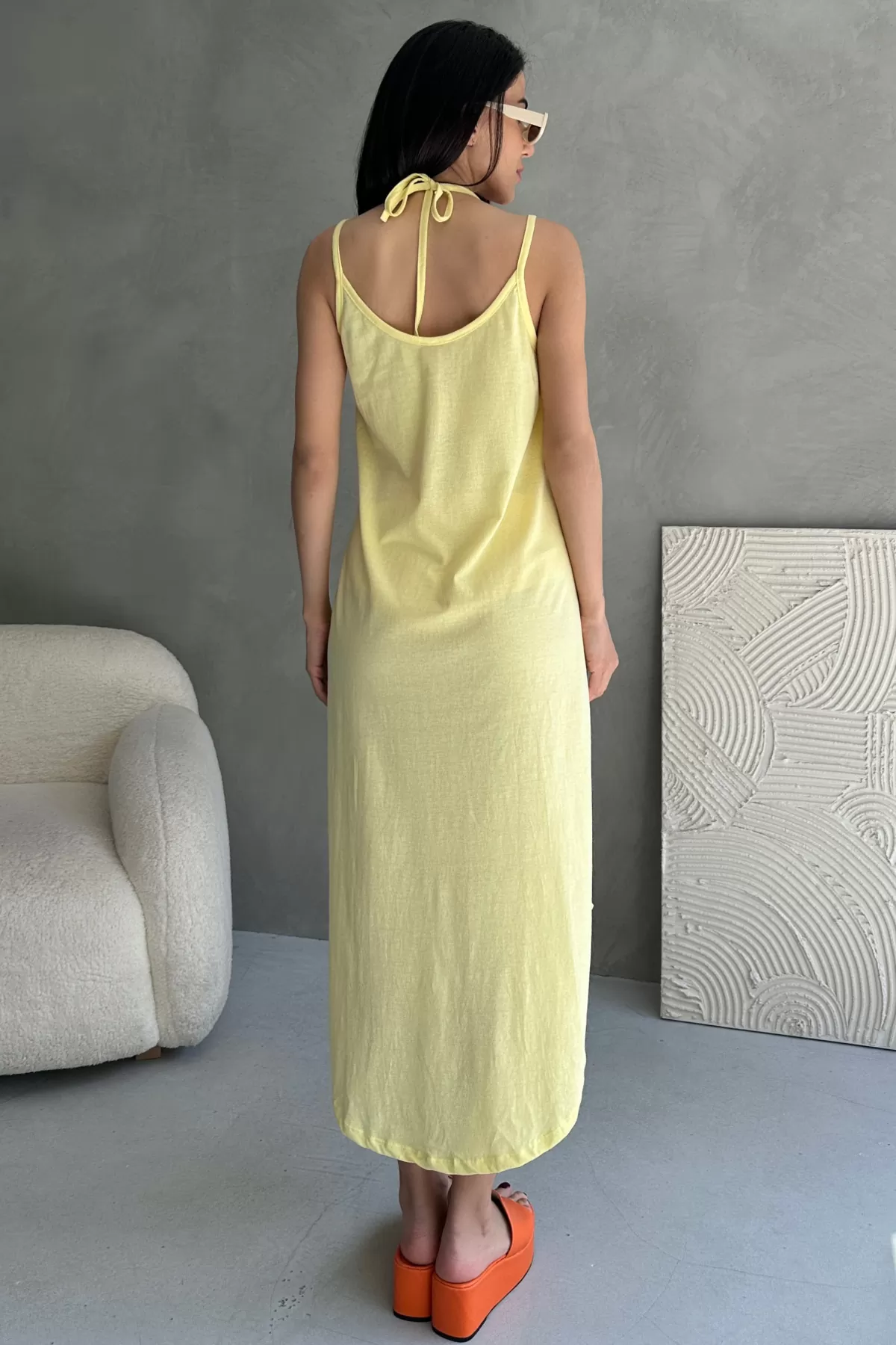 Yüzde yüz pamuklu kumaş Askılı V Yaka Sarı Midi Elbise