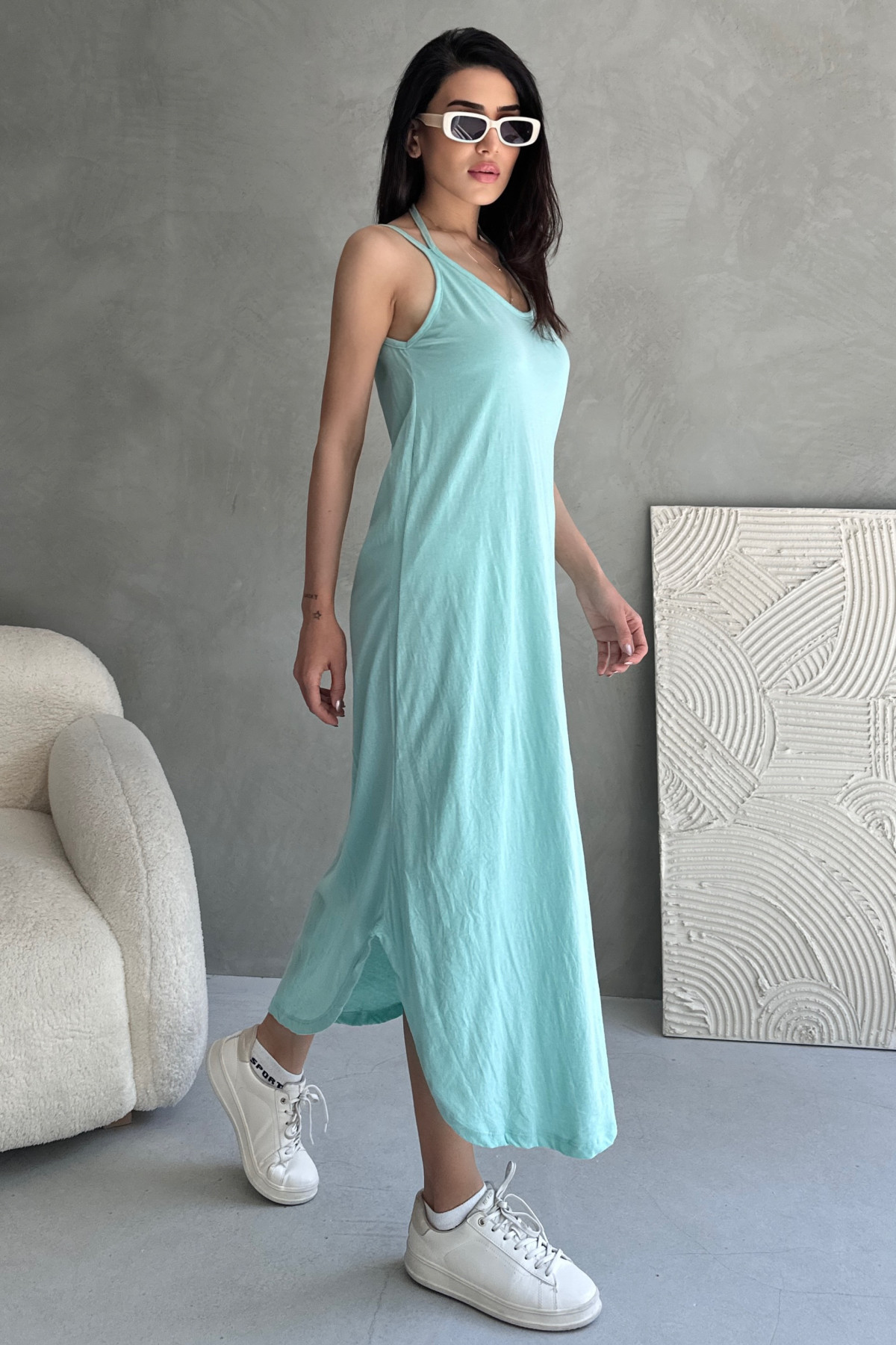 Yüzde yüz pamuklu kumaş Askılı V Yaka Su Yeşili Midi Elbise