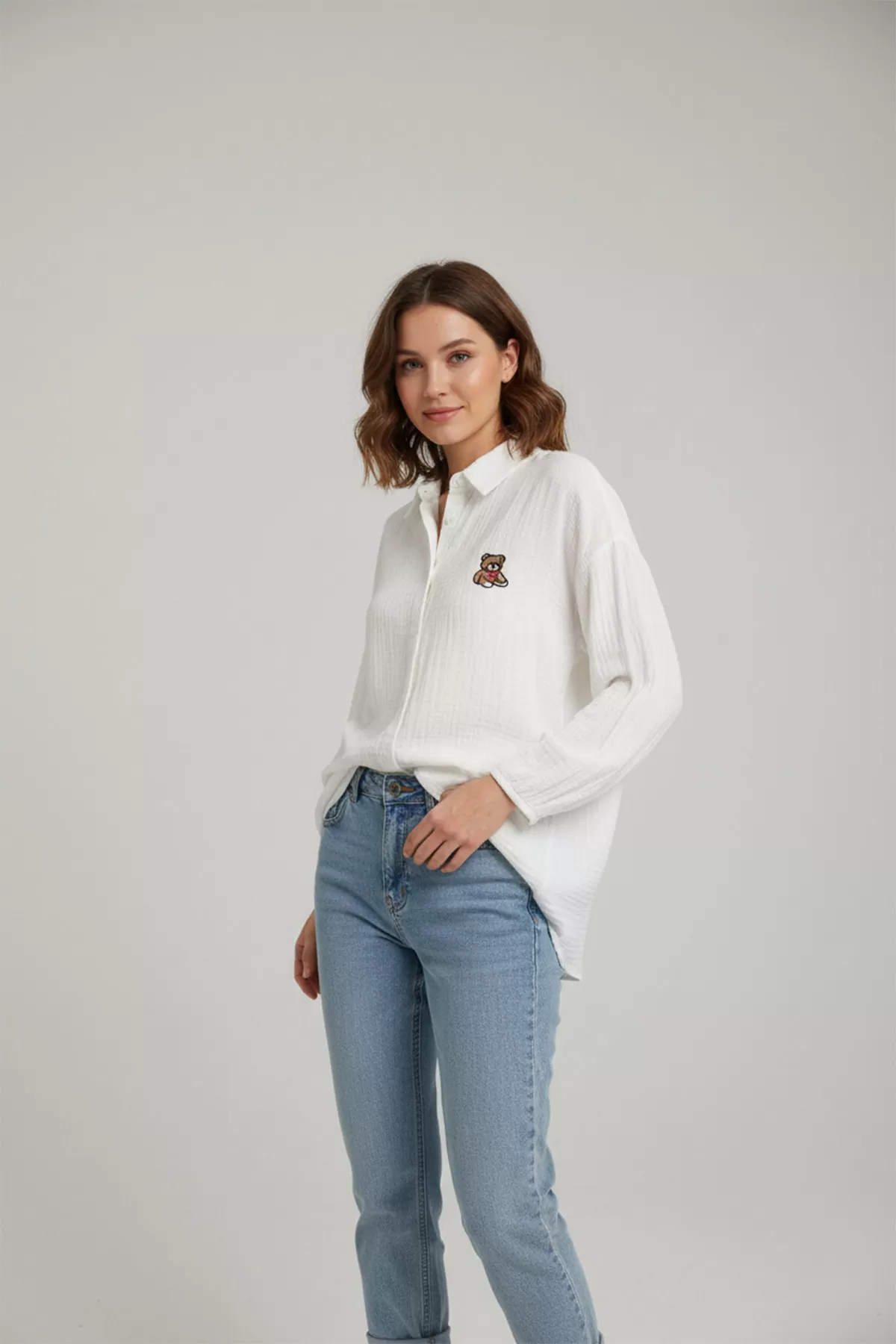 Ayıcık Nakışlı Beyaz Kadın Gömlek