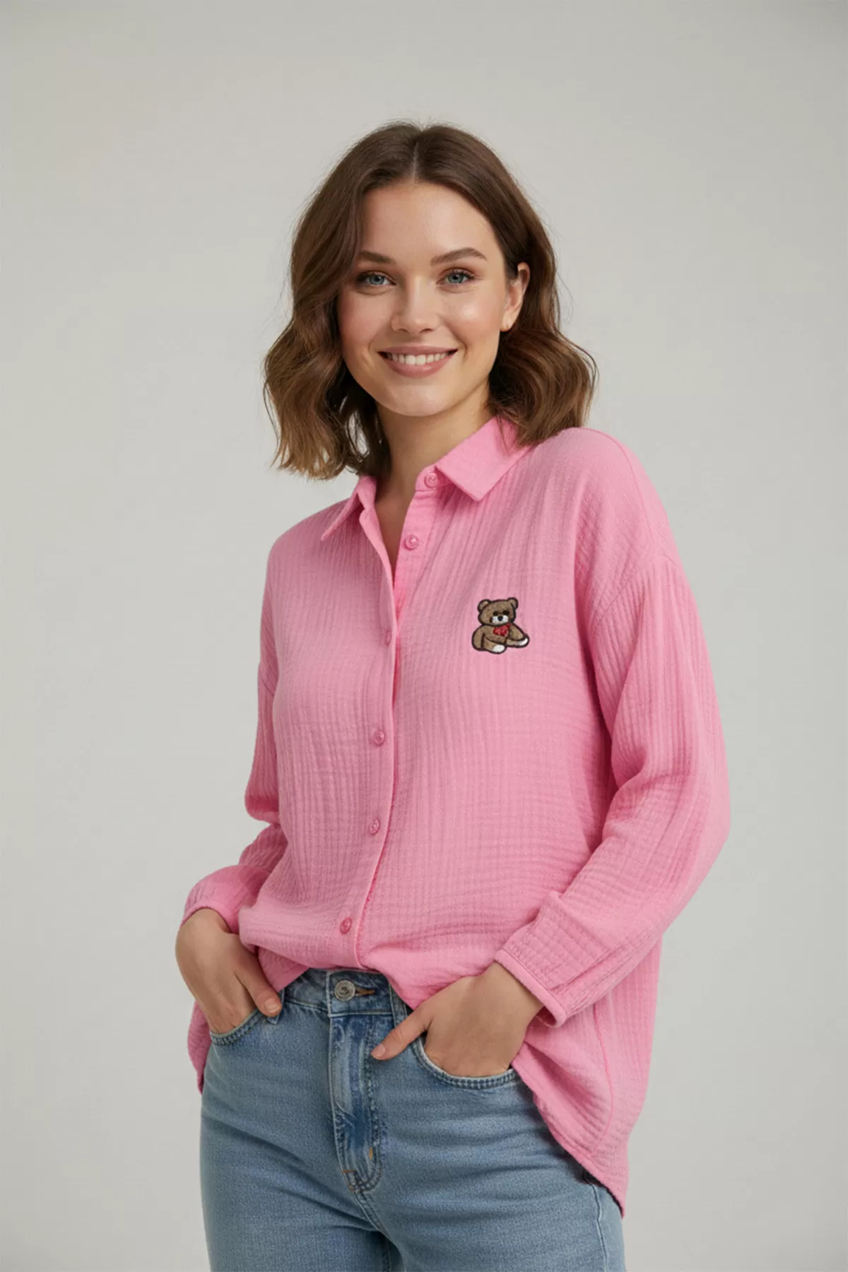 Ayıcık Nakışlı Pembe Kadın Gömlek