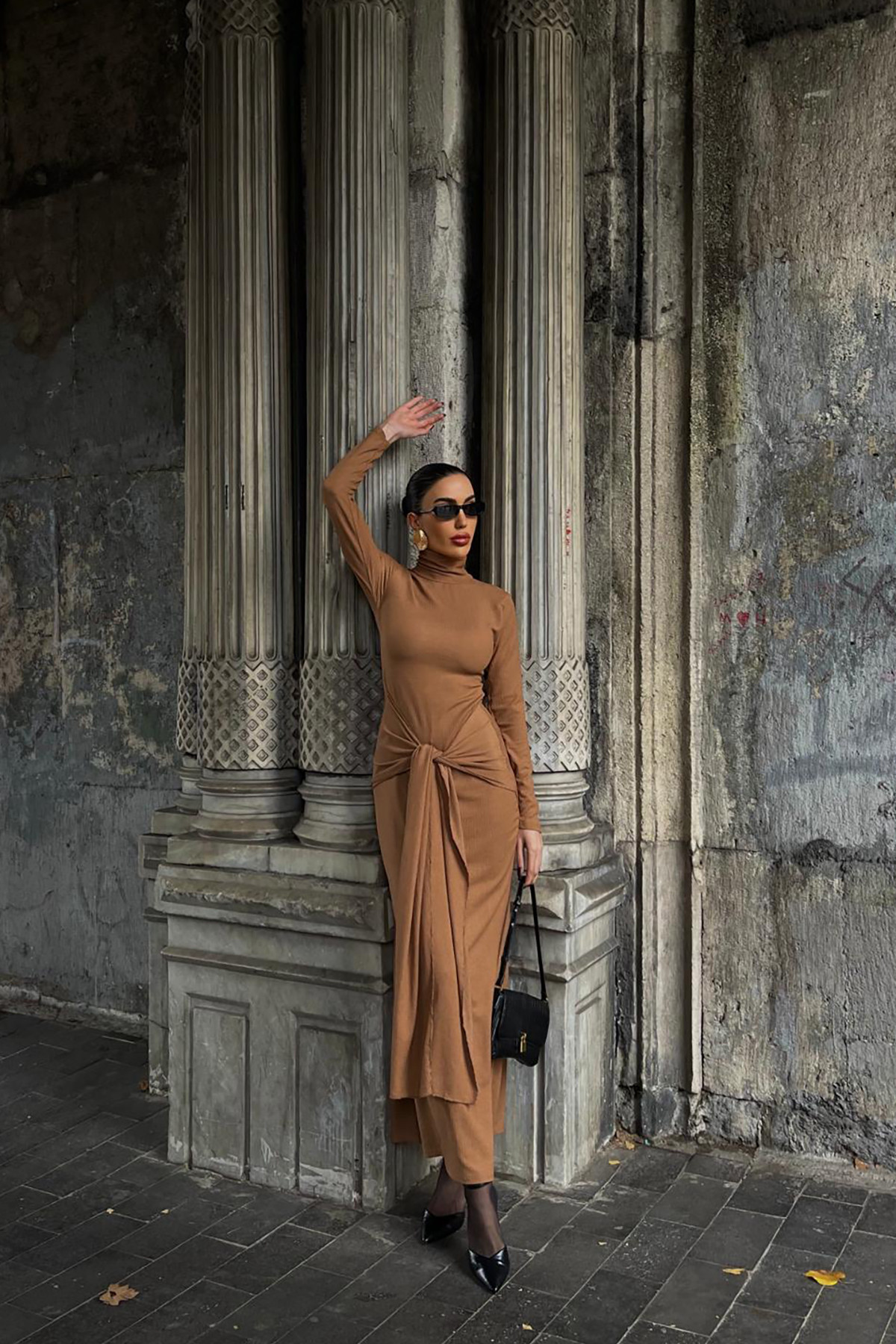 Facebook Pixel Balıkçı Yaka Kahverengi Bürümcük Kumaş Uzun Elbise, Fiyatı 229.22 TL | Nare Giyim