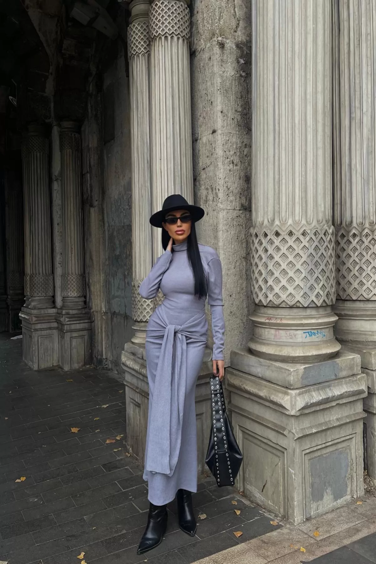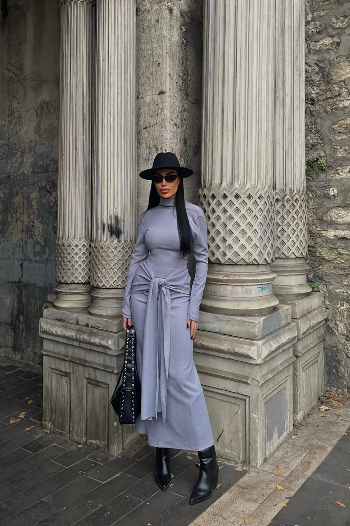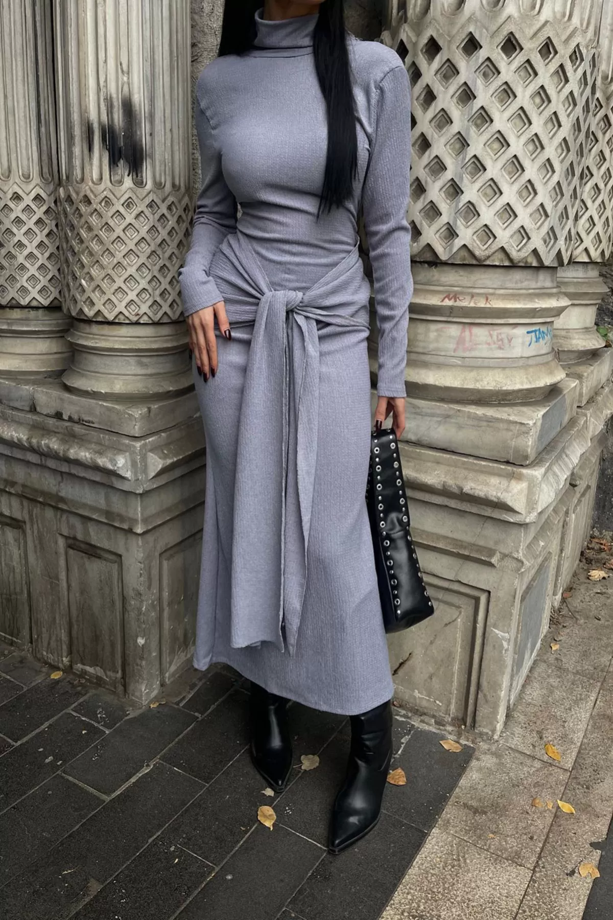 Balıkçı Yaka Lila Bürümcük Kumaş Uzun Elbise