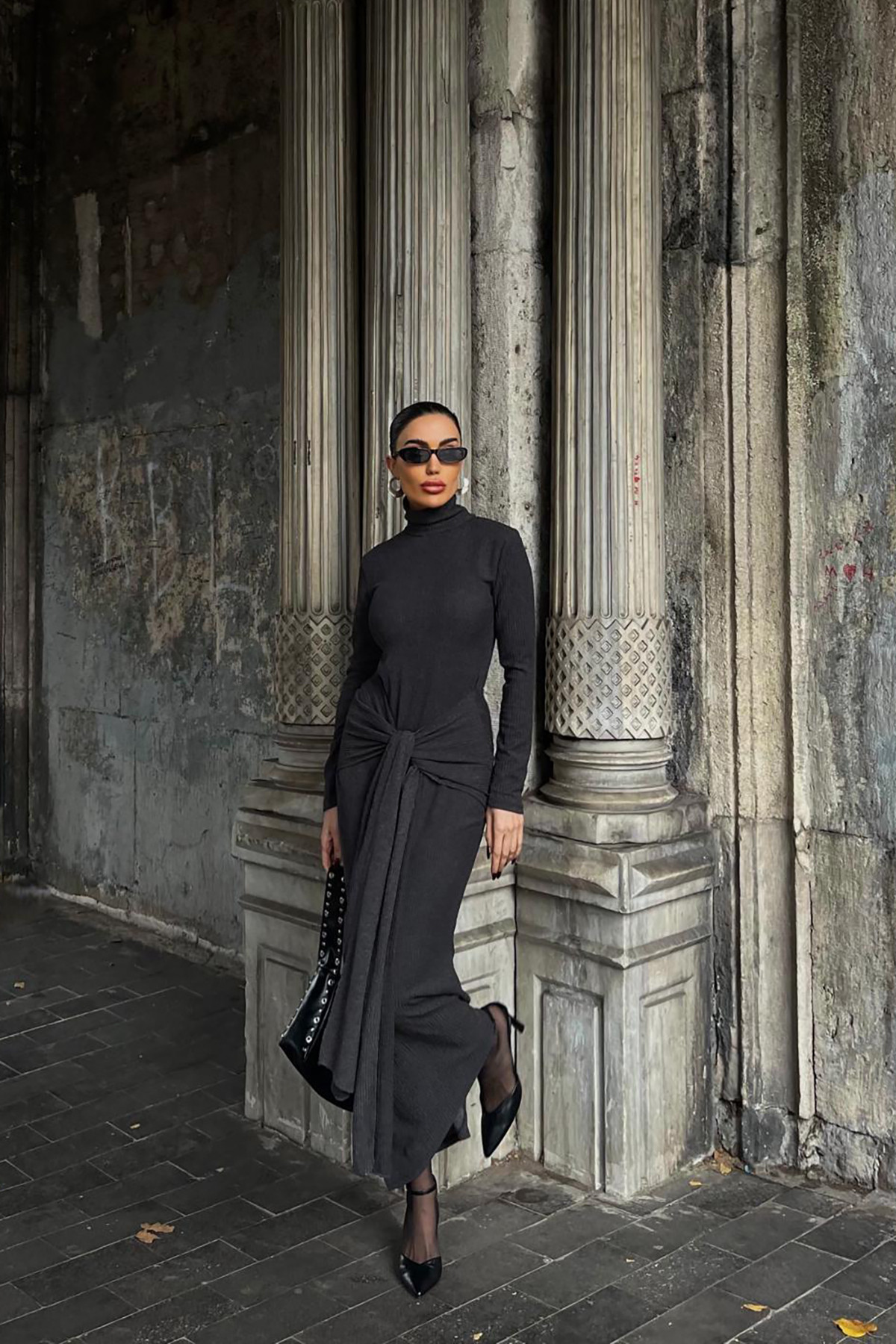 Facebook Pixel Balıkçı Yaka Siyah Bürümcük Kumaş Uzun Elbise, Fiyatı 229.22 TL | Nare Giyim