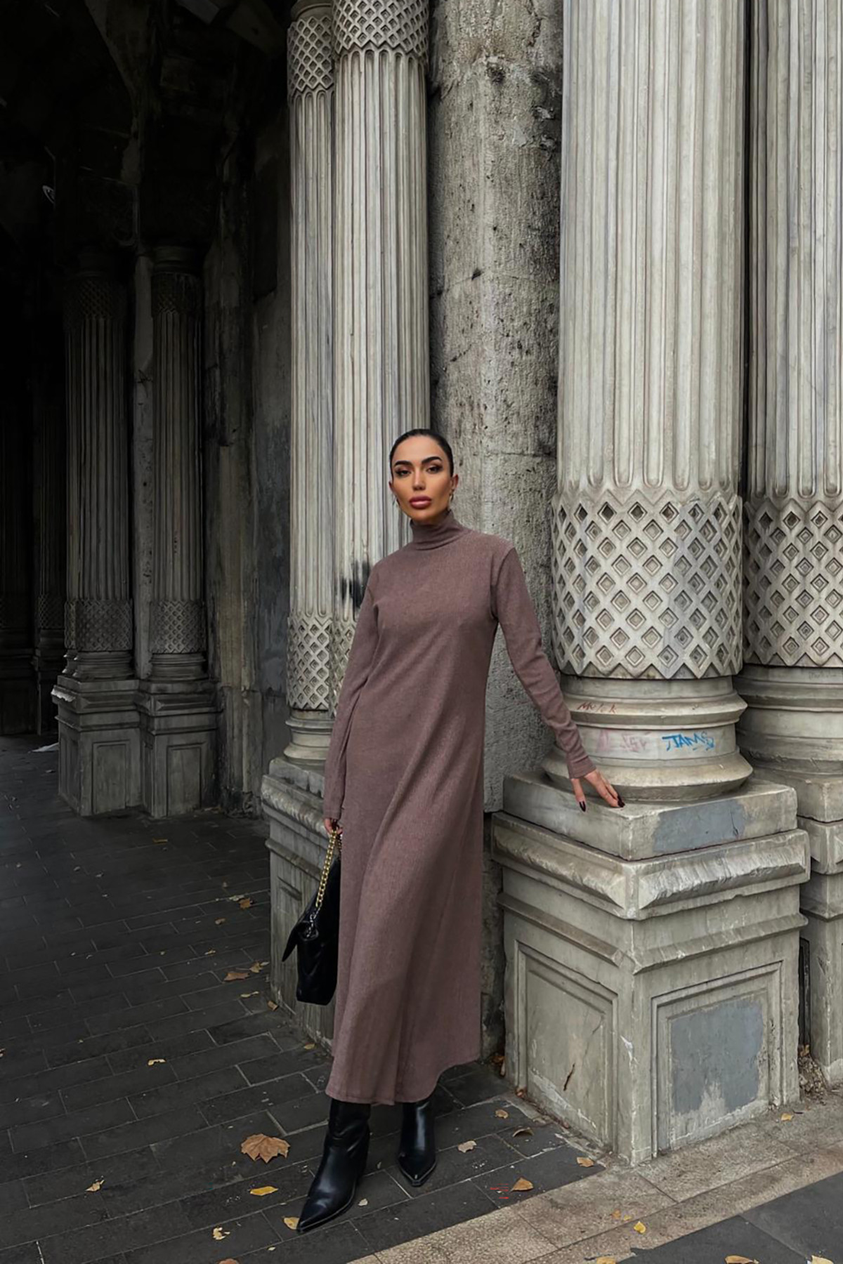 Facebook Pixel Balıkçı Yaka Sütlü Kahverengi Bürümcük Kumaş Uzun Elbise, Fiyatı 229.22 TL | Nare Giyim