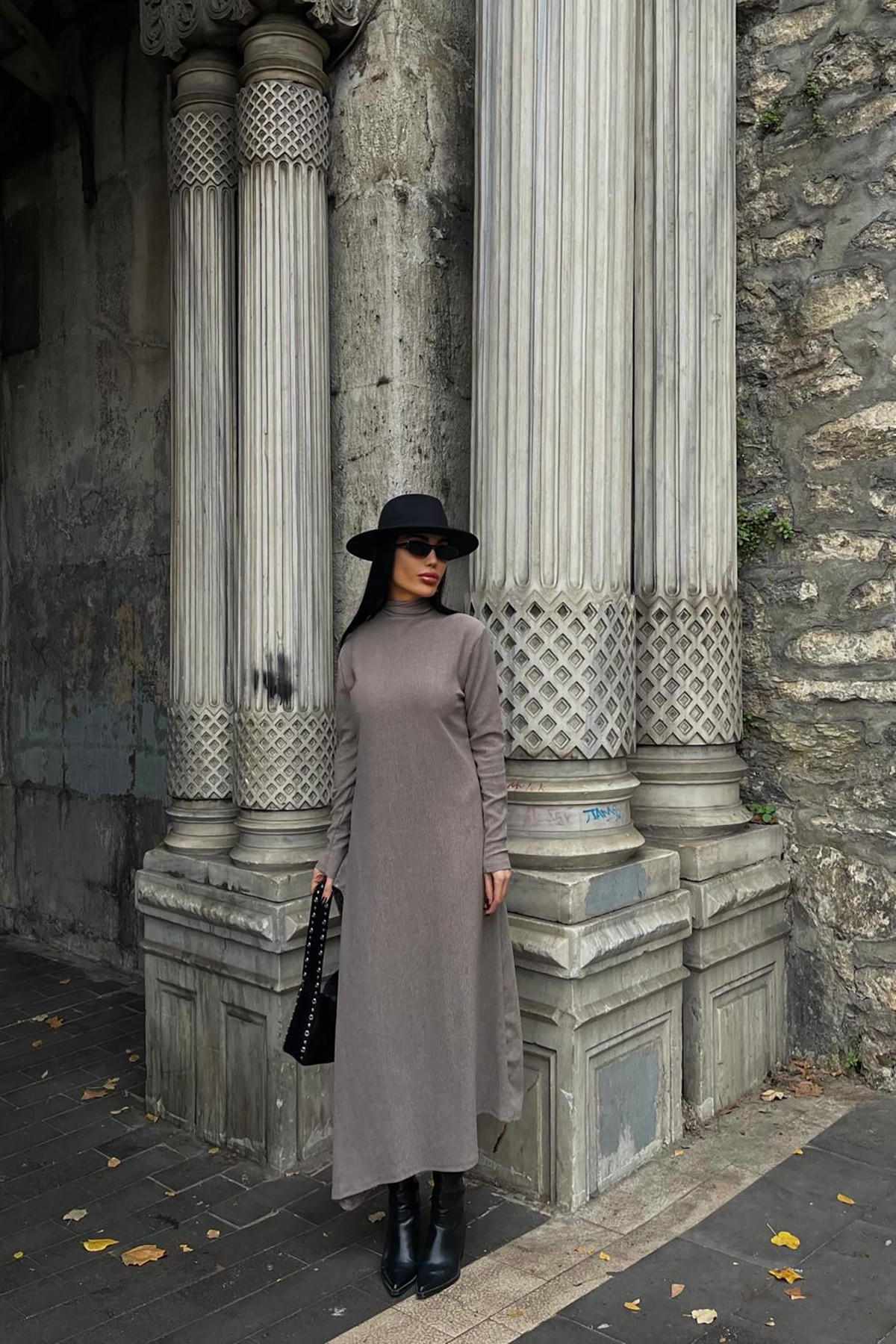 Facebook Pixel Balıkçı Yaka Taş Rengi Bürümcük Kumaş Uzun Elbise, Fiyatı 229.22 TL | Nare Giyim
