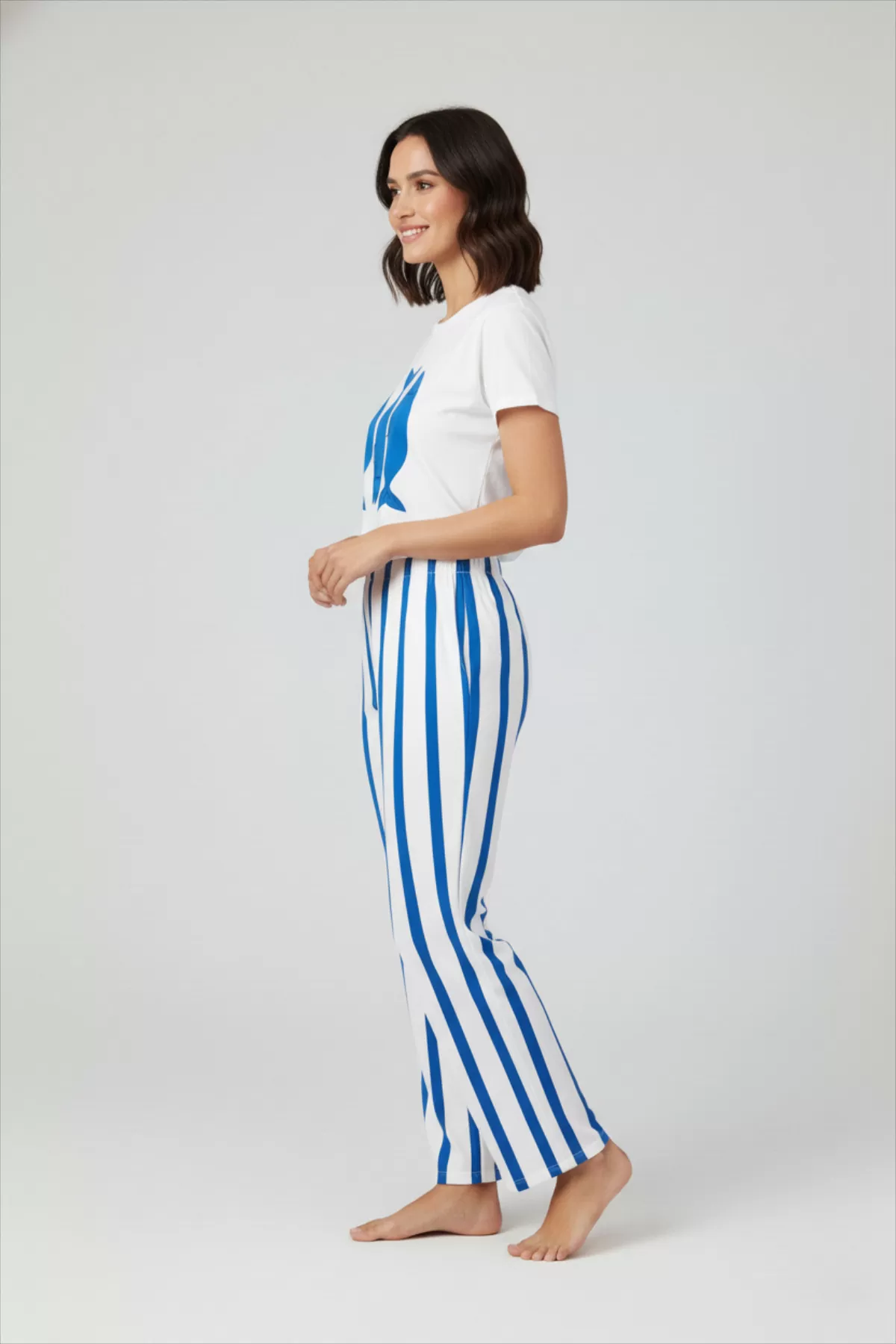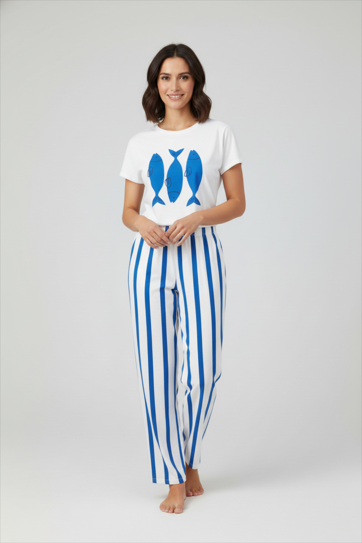 Baskılı Çizgili Pamuklu Kadın Alt Üst Takım Baskılı Çizgili Pamuklu Kadın Alt Üst Takım