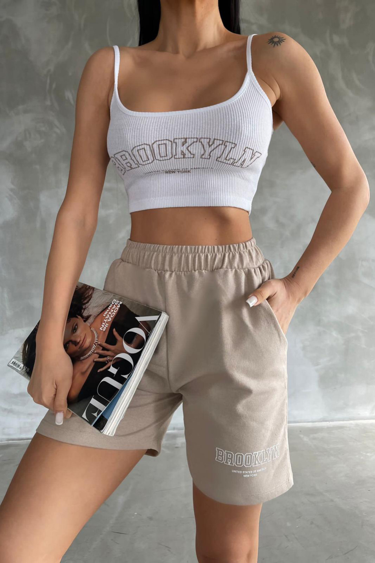 Bej Beyaz Şort Askılı Crop Kadın Alt Üst Takım