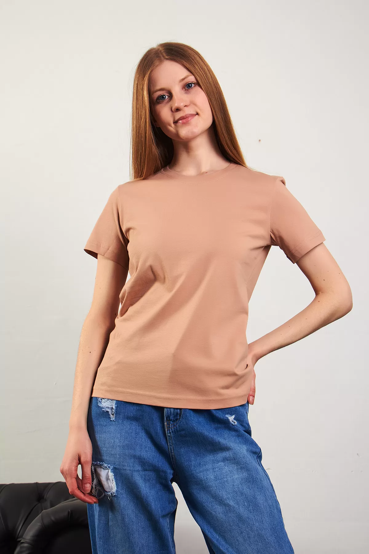 Bej Pamuklu Bisiklet Yaka Basic Kadın Tişört
