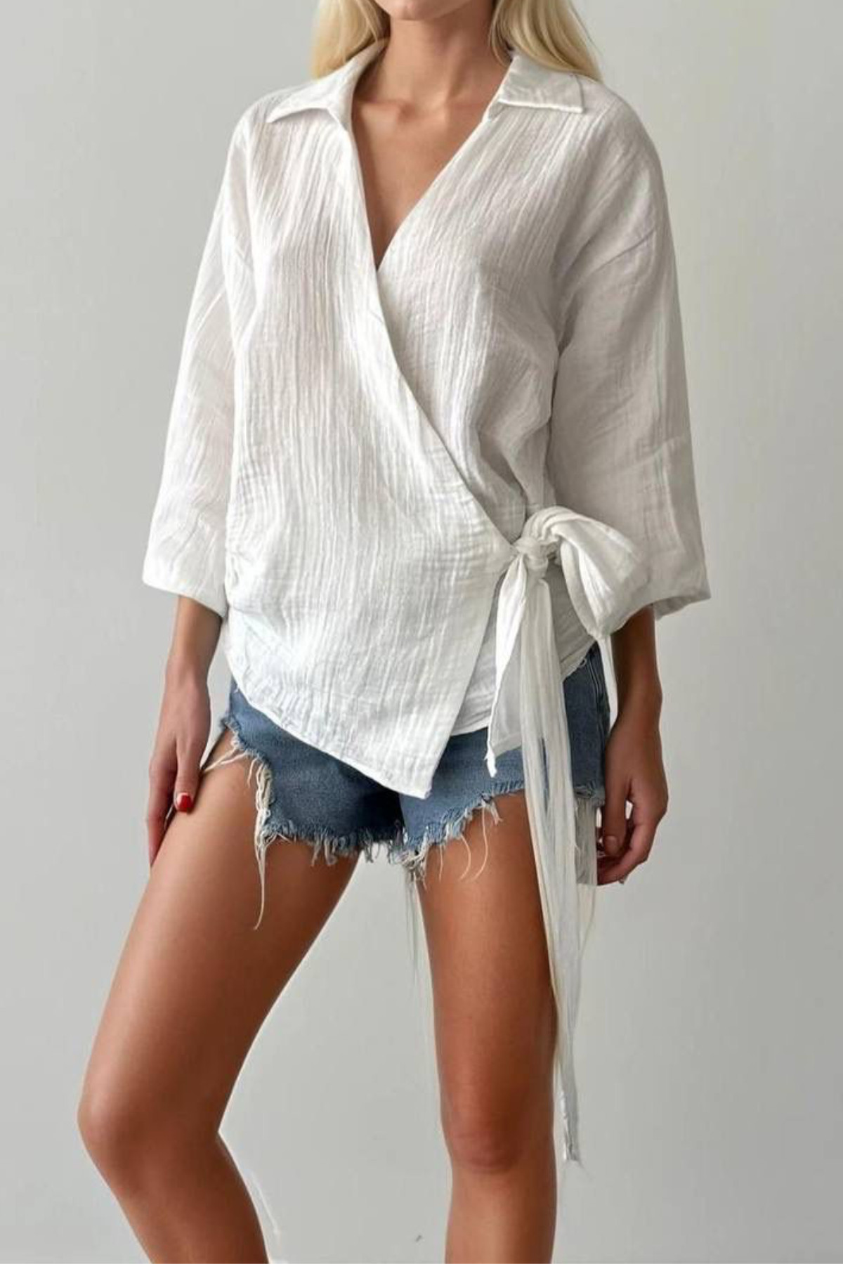 Facebook Pixel Beyaz Pamuklu Müslin Kumaş Kruvaze Bluz, Fiyatı 839.97 TL | Nare Giyim