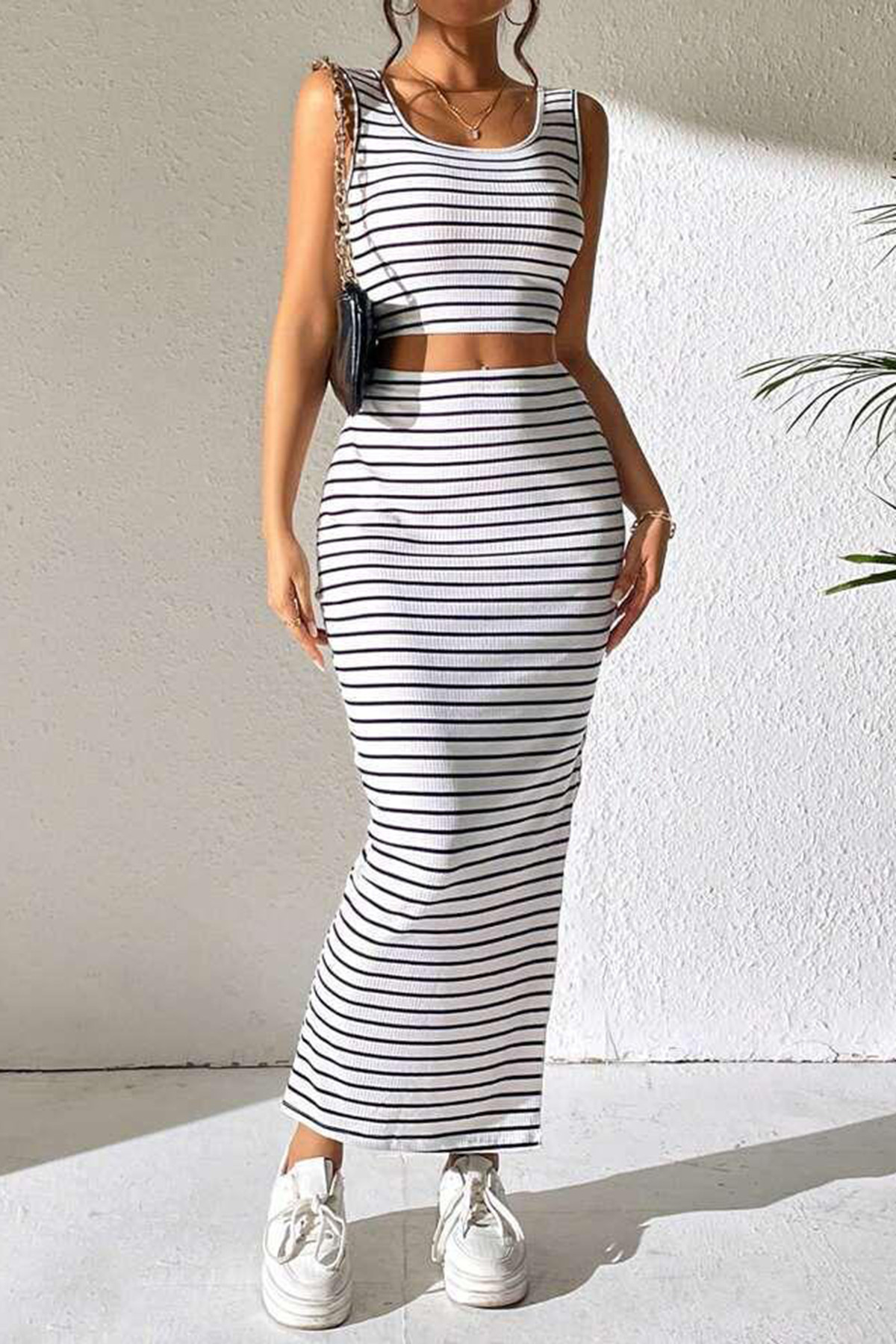 Beyaz Siyah Çizgili Etek Bluz Alt Üst Takım