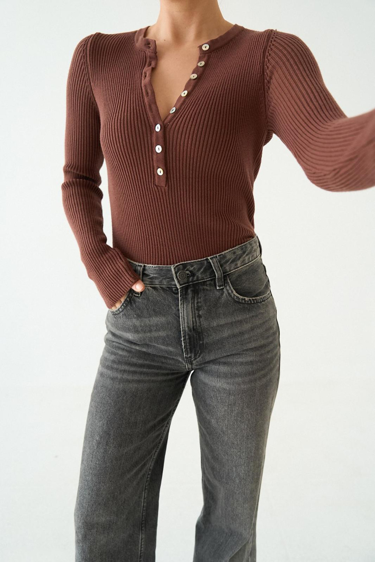 Bisiklet Yaka Düğmeli Kahverengi Triko Kadın Kazak