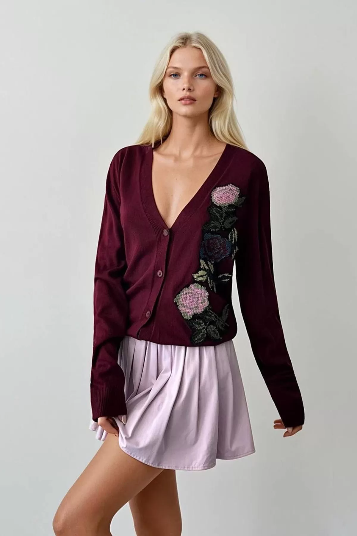 Facebook Pixel Çiçekli Bordo Triko Kadın Hırka, Fiyatı 559.97 TL | Nare Giyim