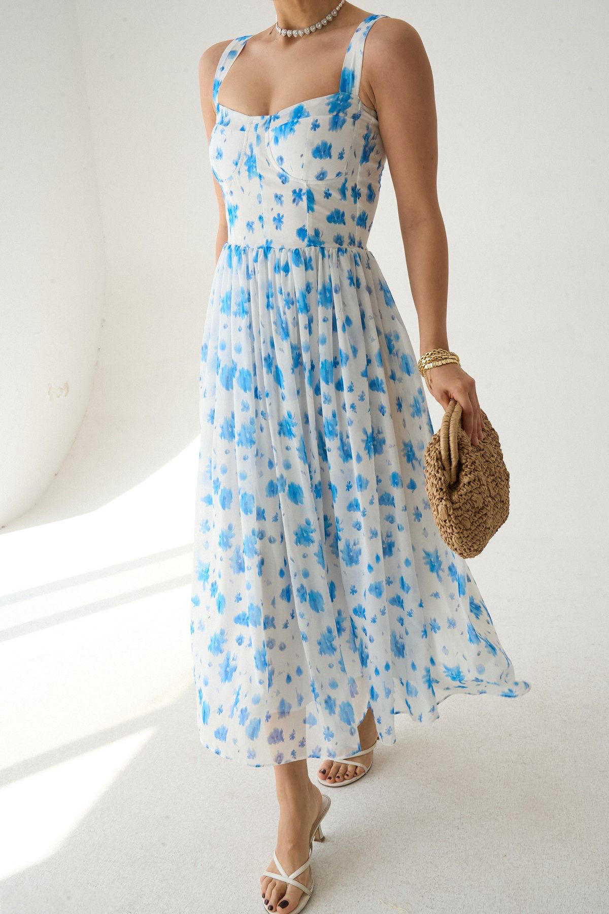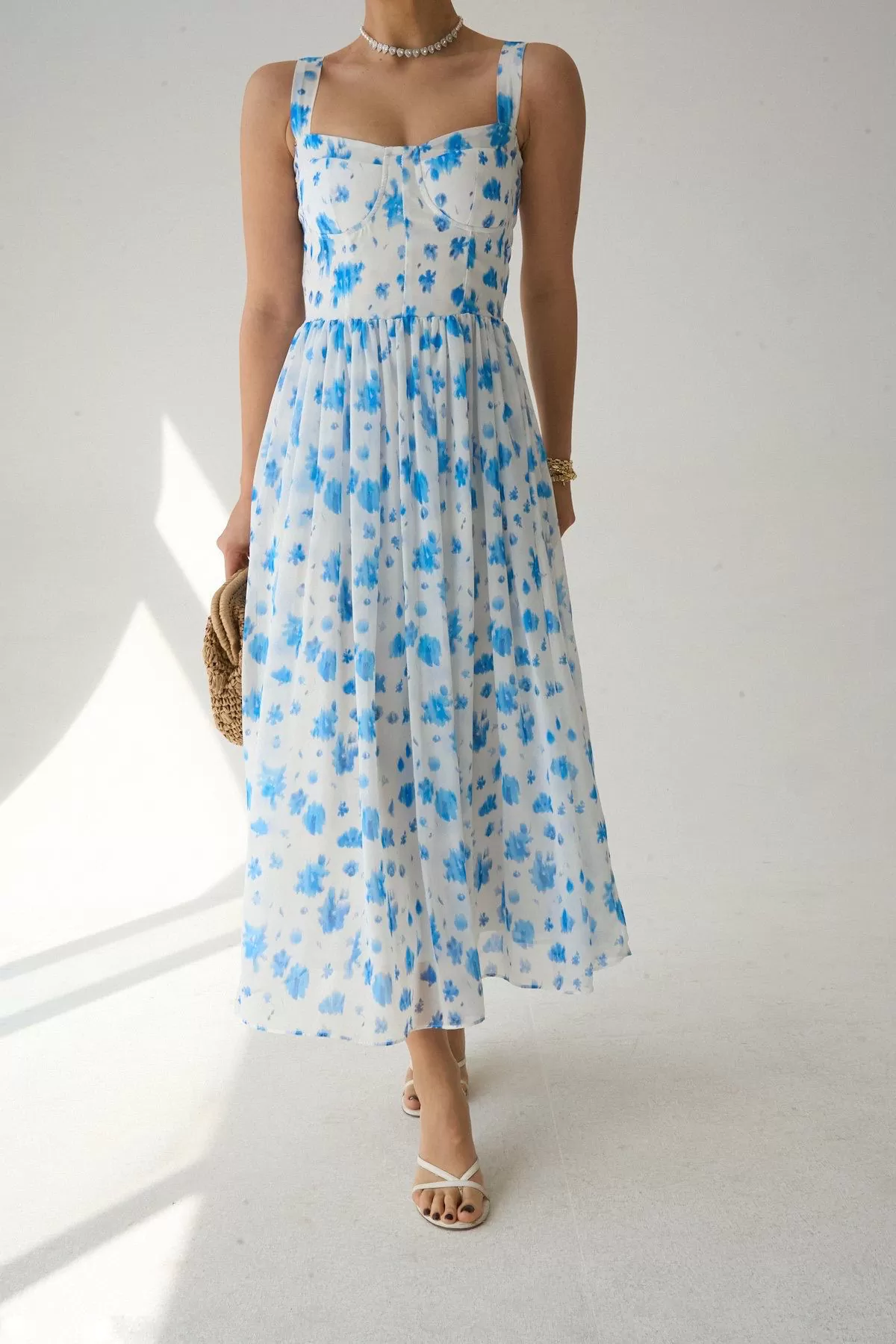 Çiçek Baskılı Mavi Uzun Şifon Elbise