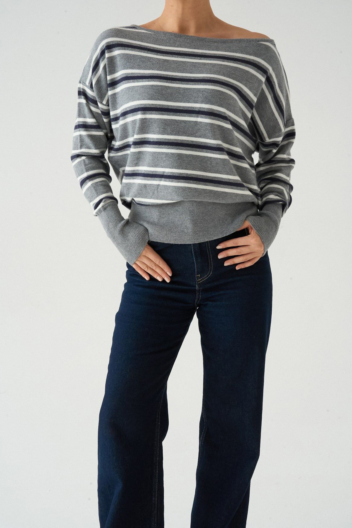 Çizgili Kayık Yaka Gri Kadın Kazak