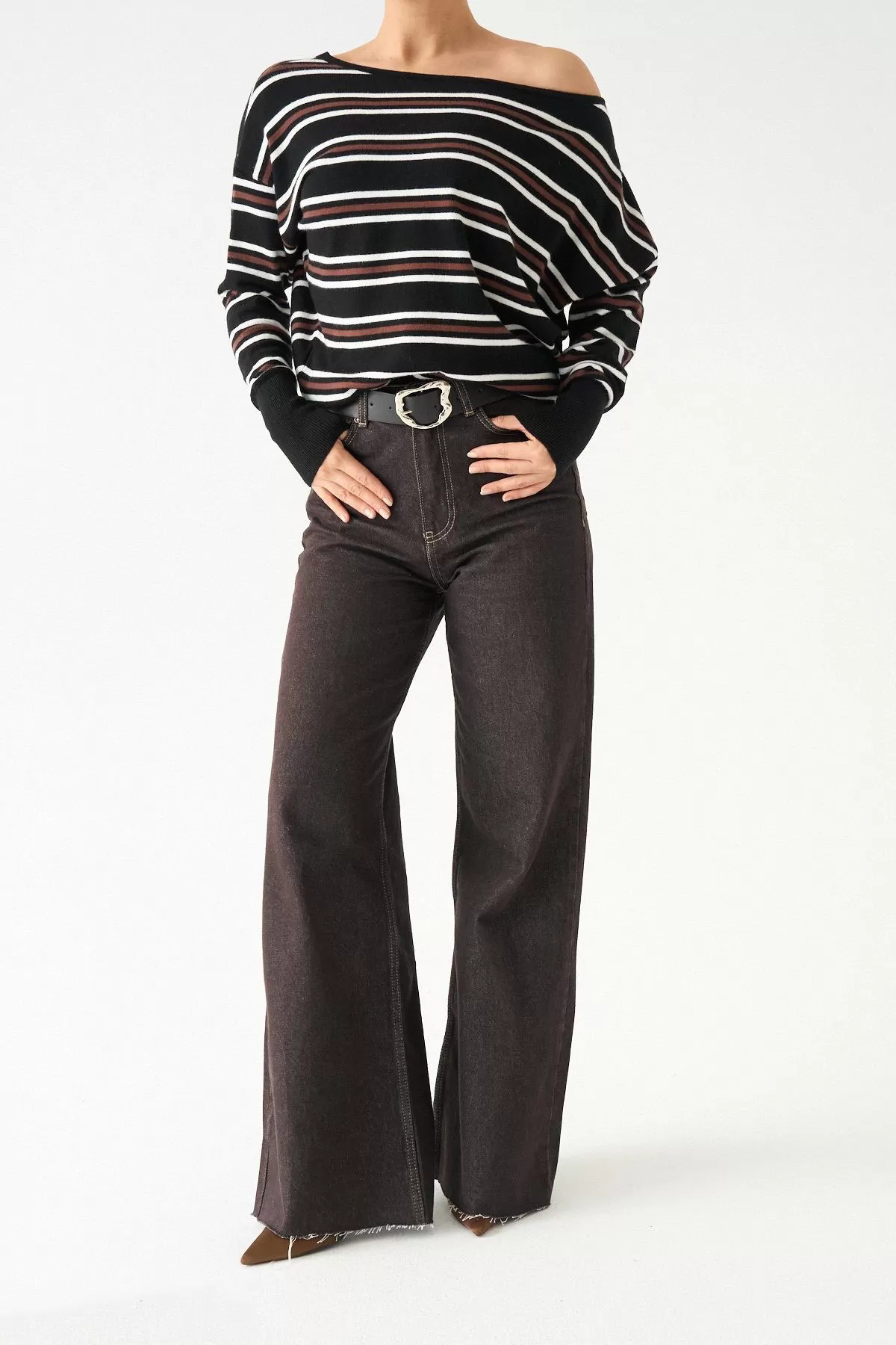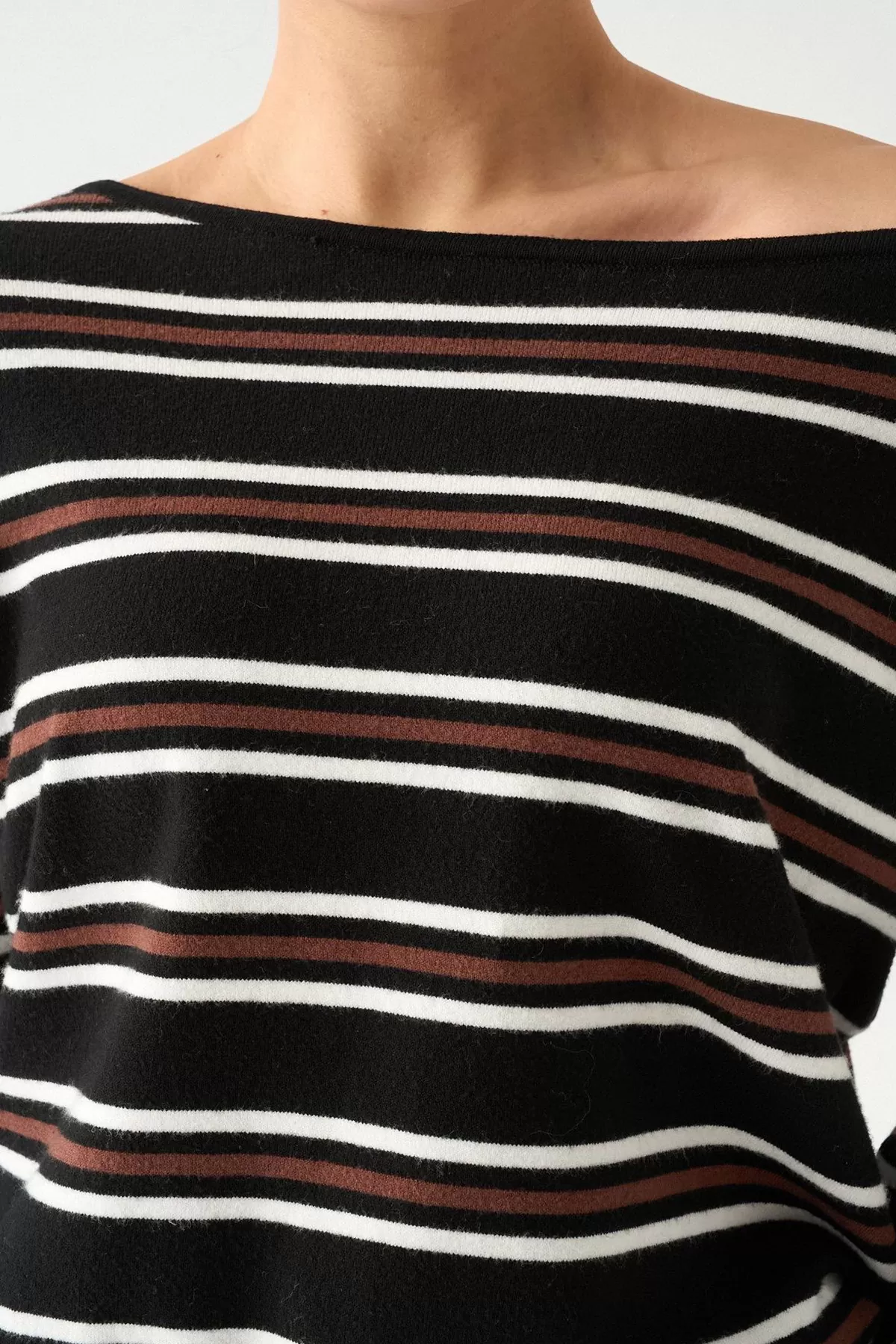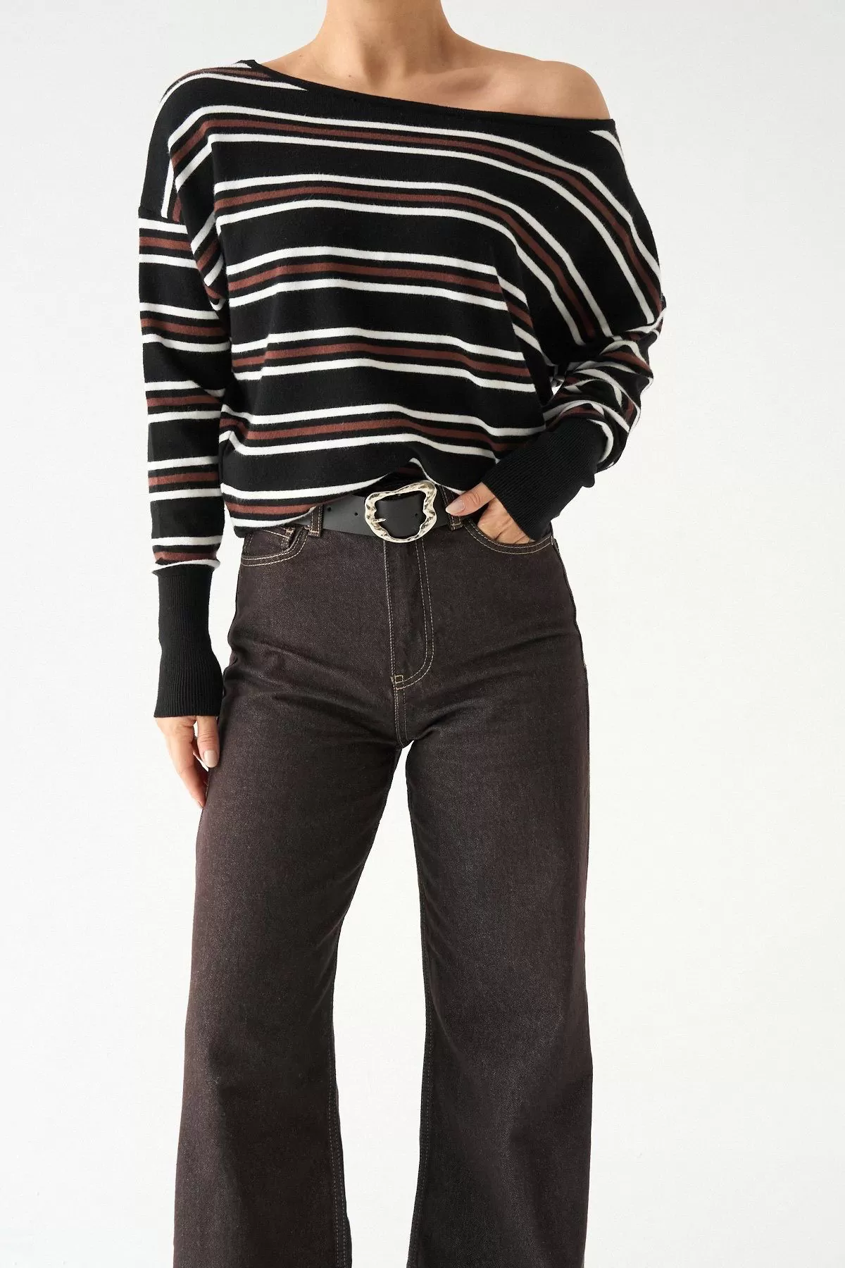 Çizgili Kayık Yaka Gri Kadın Kazak