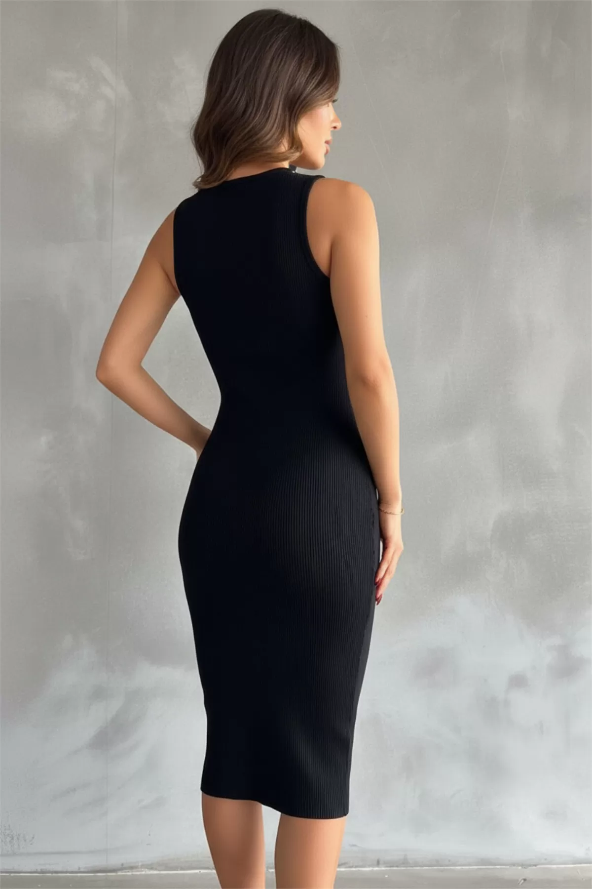 Damla Pencere Detaylı Taşlı Siyah Midi Elbise