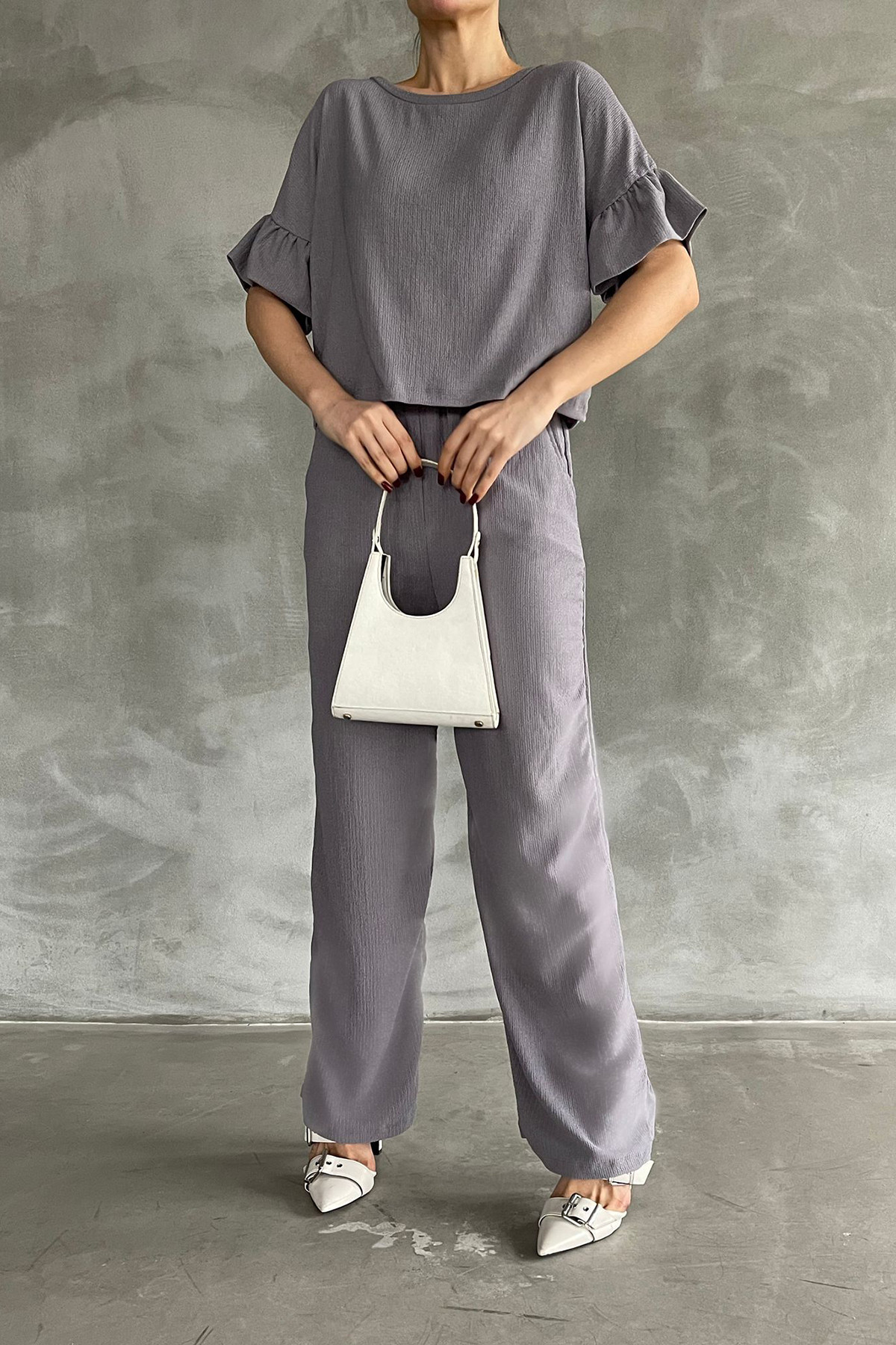 Fırfır Detaylı Gri Bluz Pantolon Alt Üst Takım