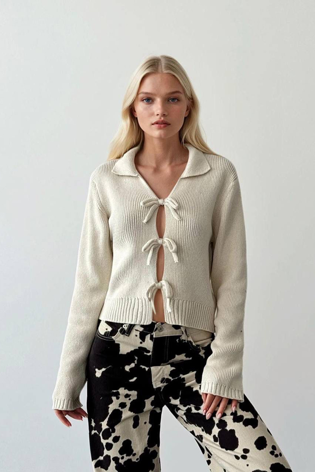 Fiyonklu Ekru Triko Kadın Hırka