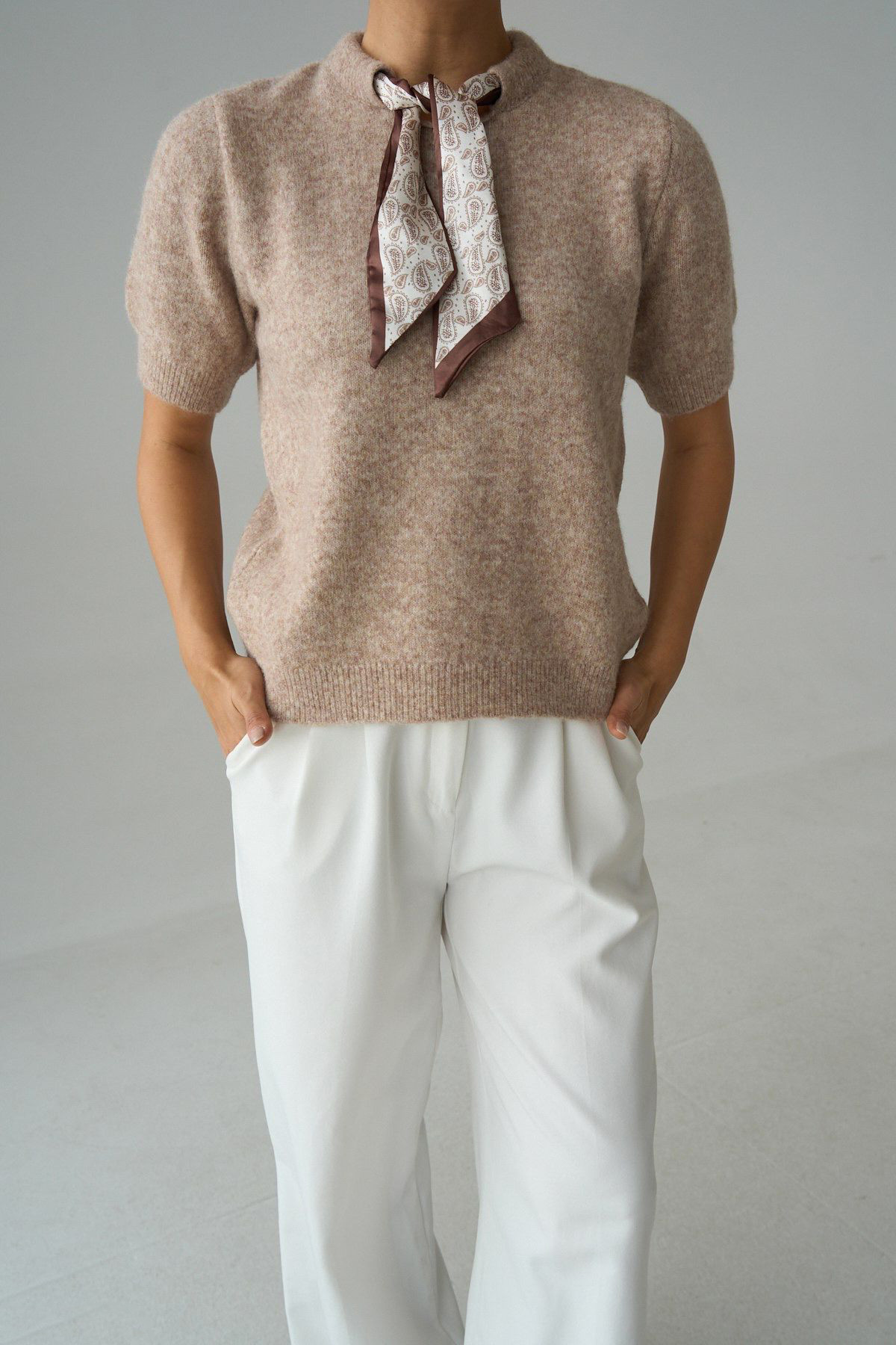 Facebook Pixel Fular Detaylı Kısa Kollu Bej Yünlü Kadın Kazak, Fiyatı 629.97 TL | Nare Giyim