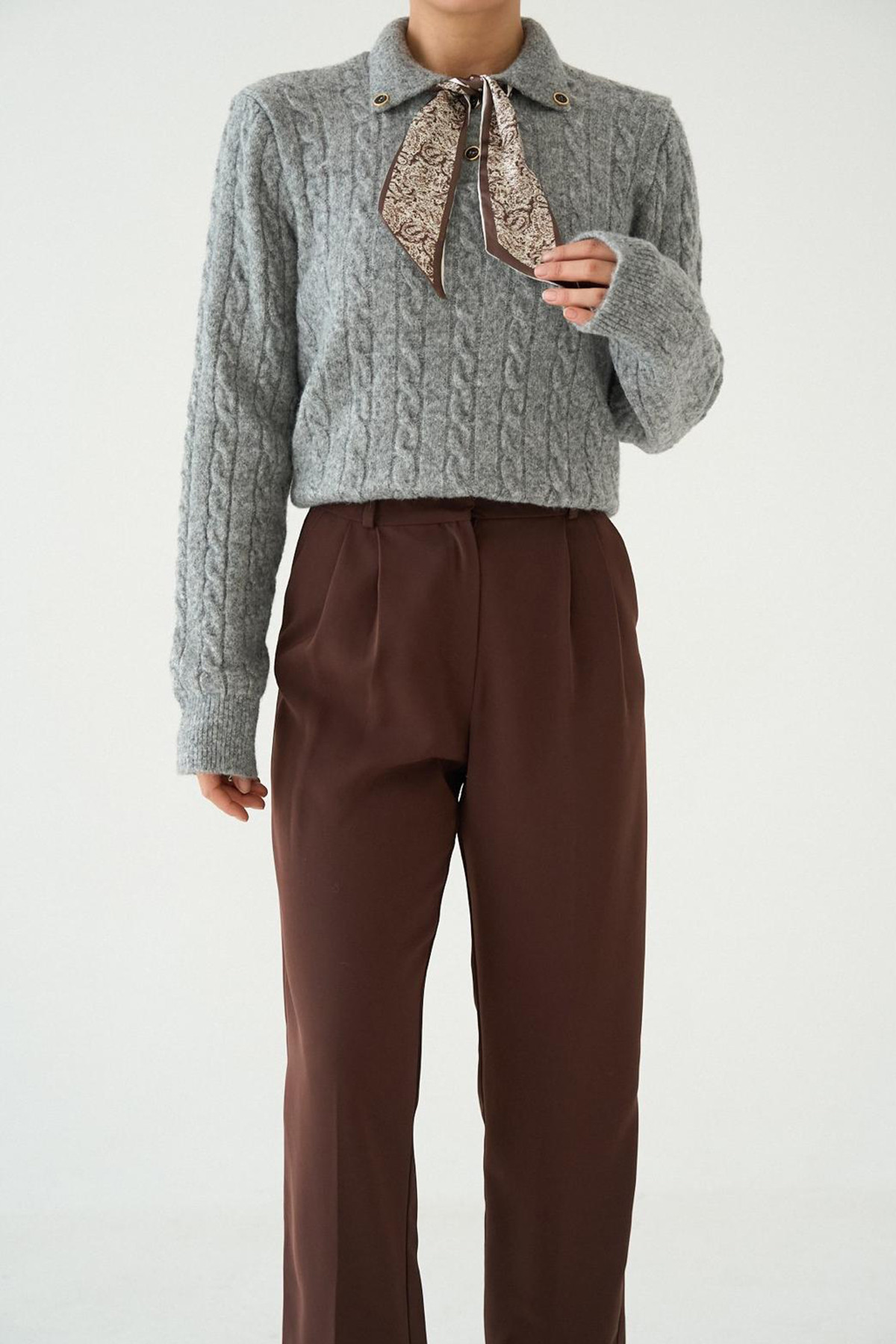 Fular Detaylı Uzun Kollu Gri Triko Kadın Kazak