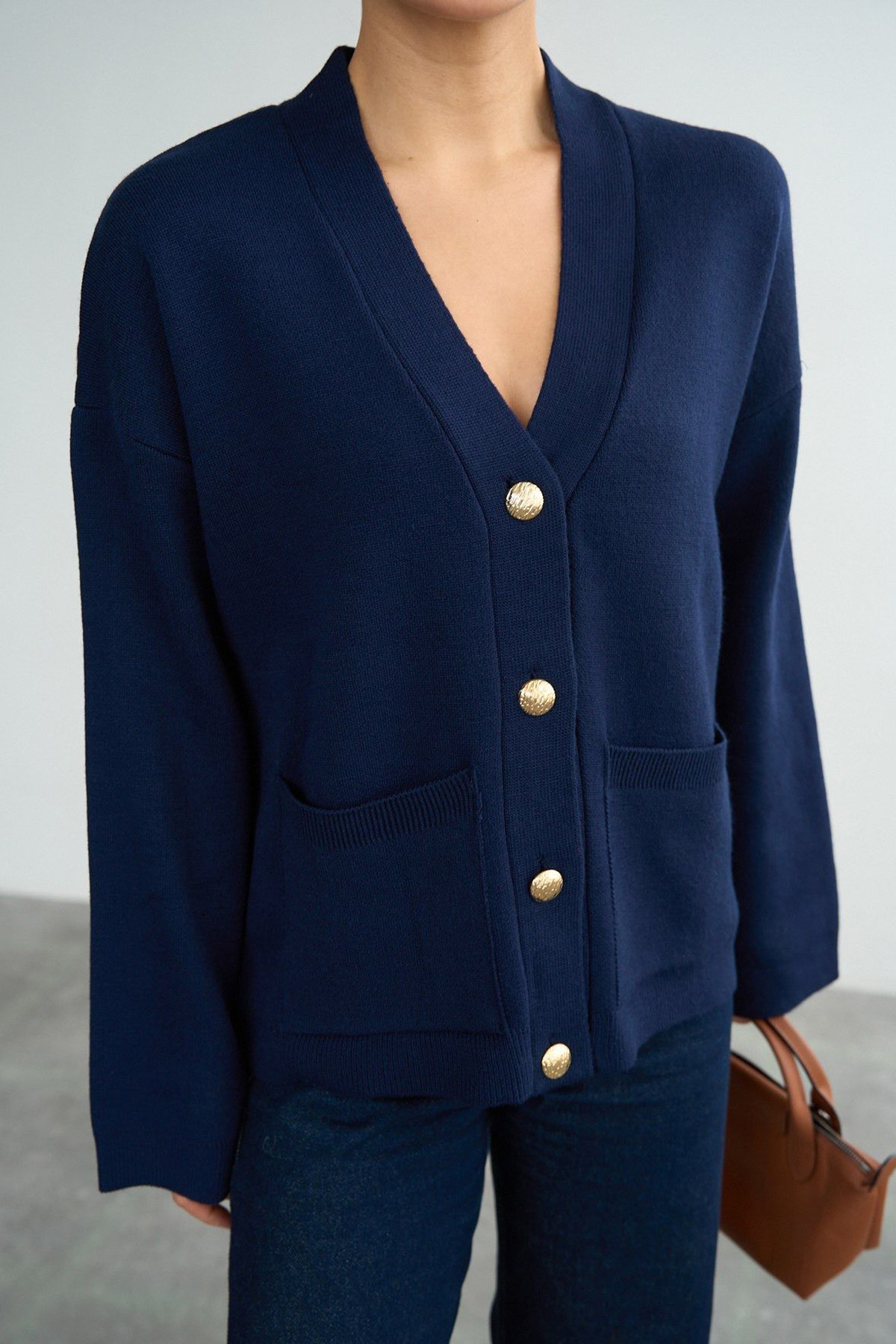 Gold Düğmeli Lacivert Triko Kadın Hırka