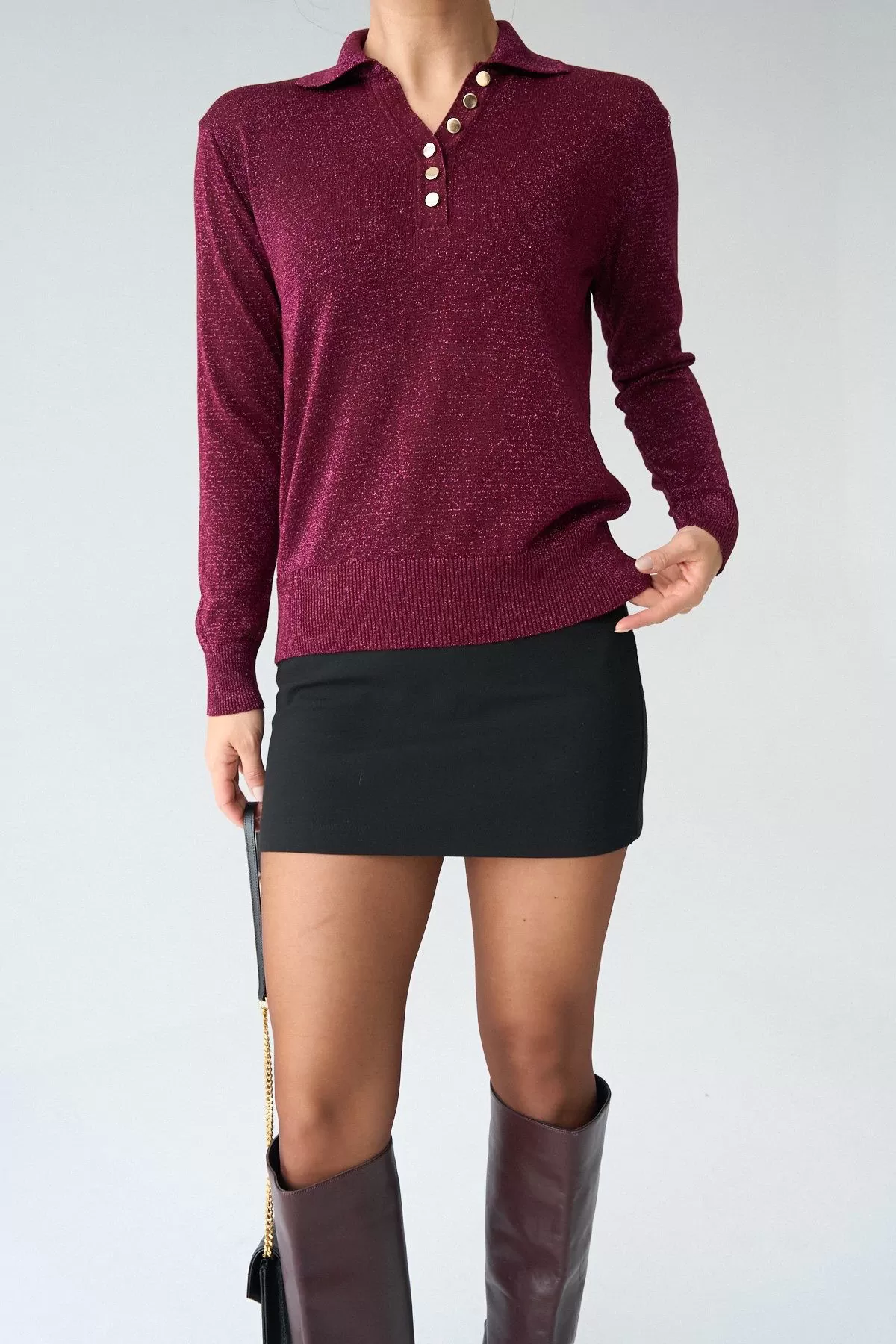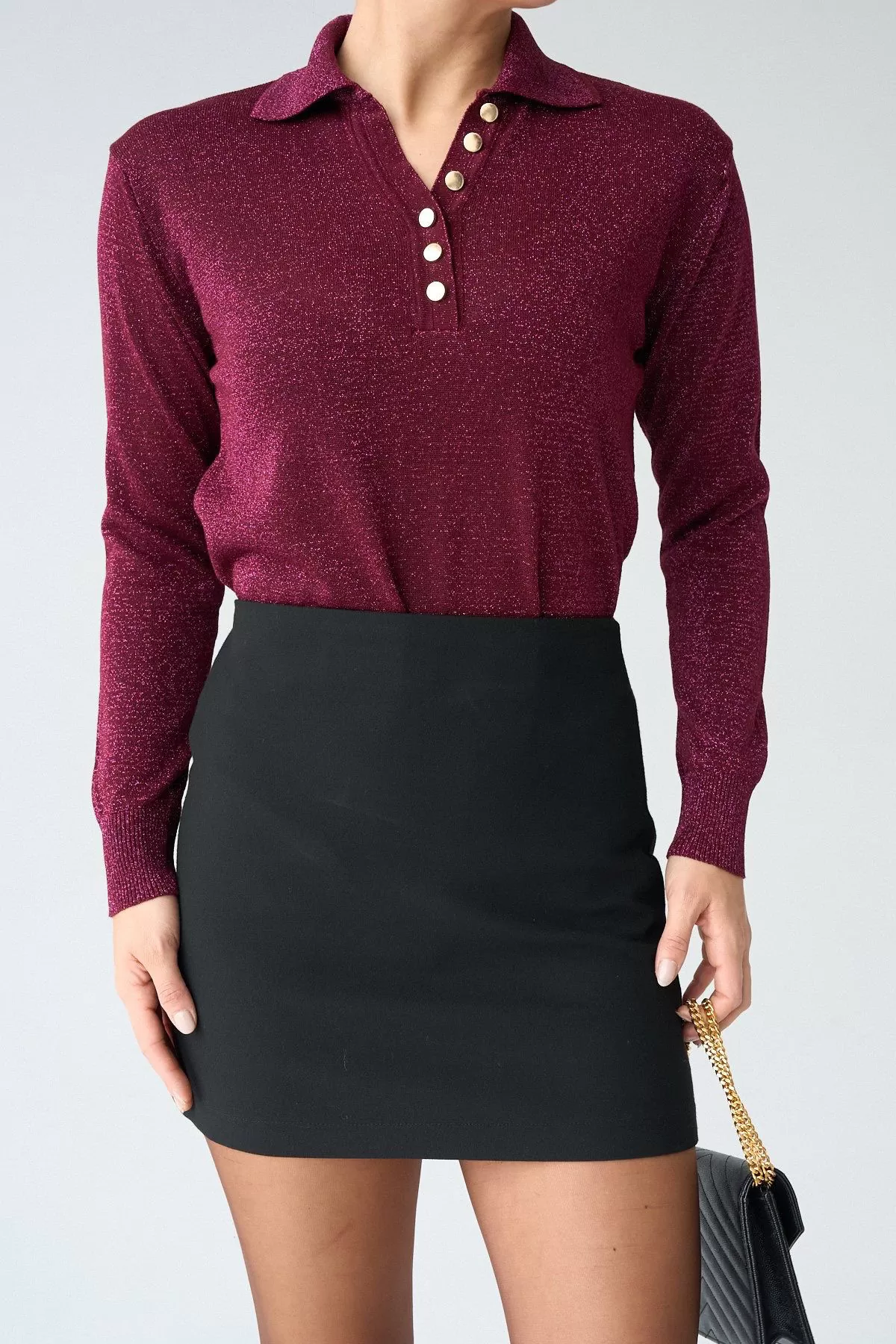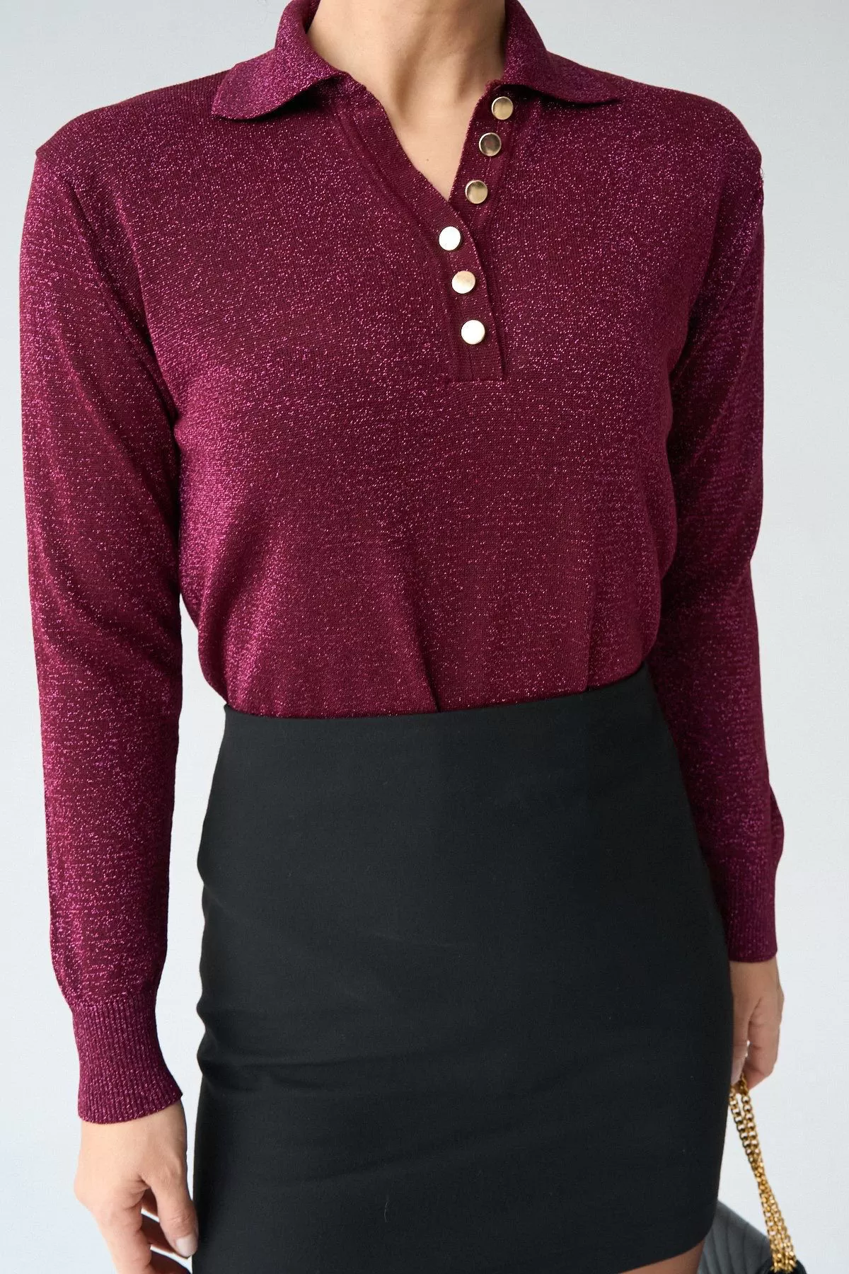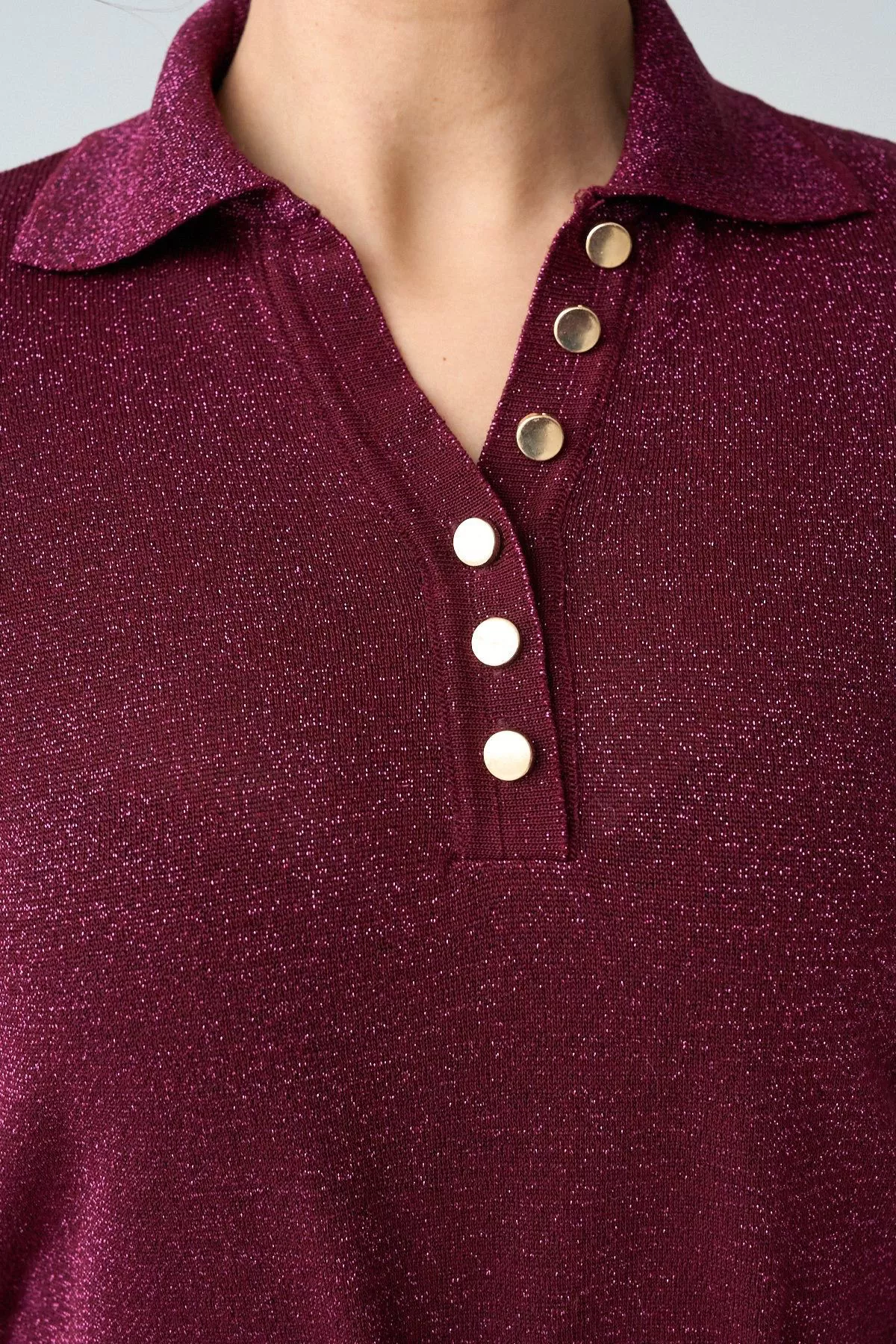 Gold Düğmeli Simli Bordo Kadın Kazak