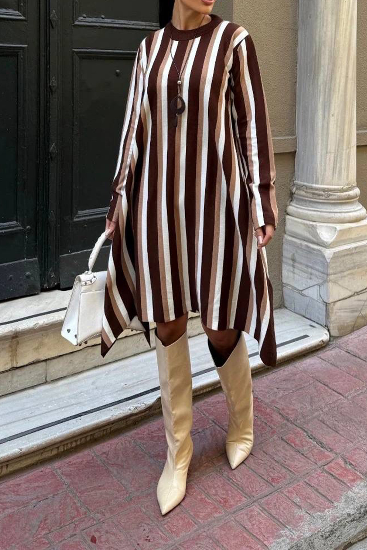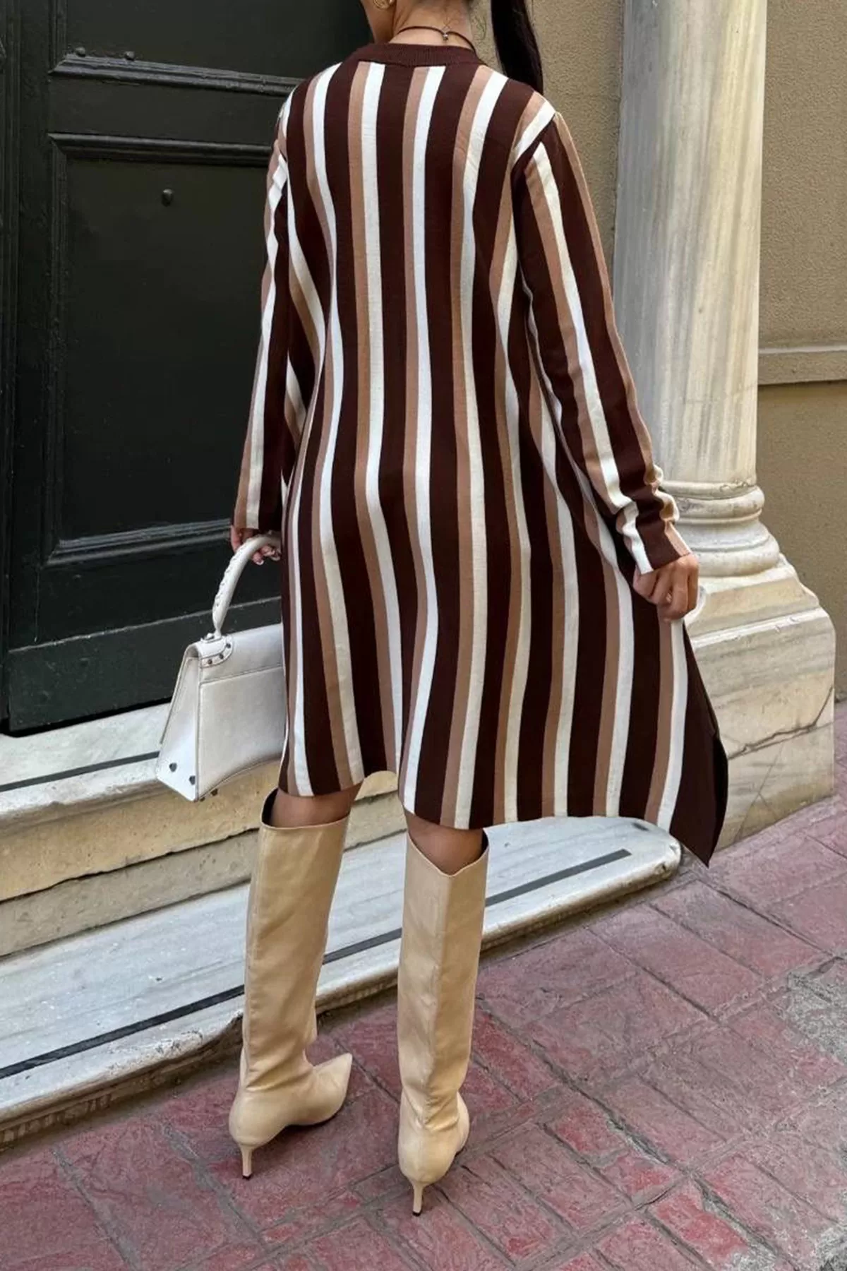 Kahverengi Beyaz Çizgili Triko Kısa Elbise