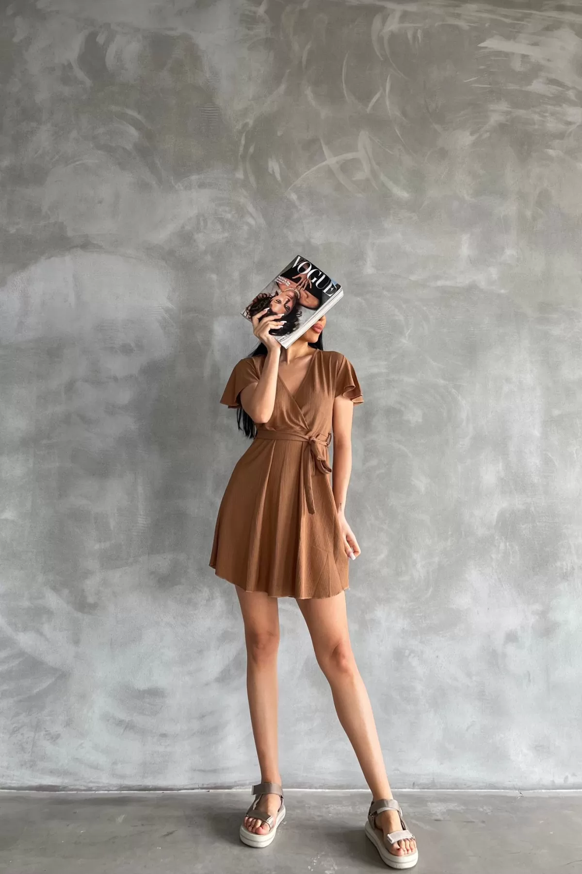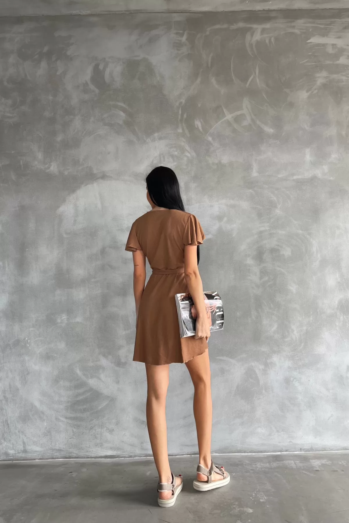 Kahverengi Bürümcük Kumaş Kısa Elbise