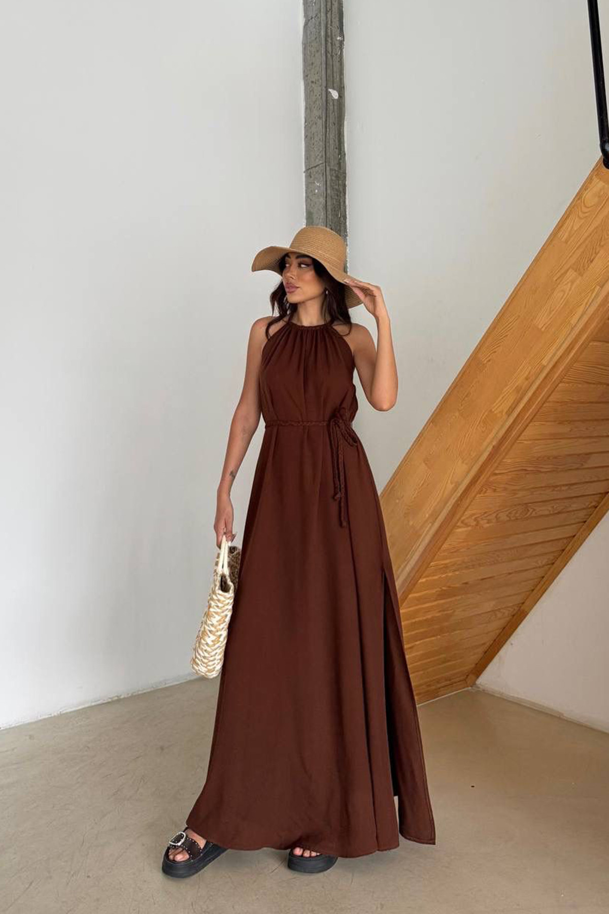 Kahverengi Pamuk Keten Yırtmaçlı Maksi Boy Elbise