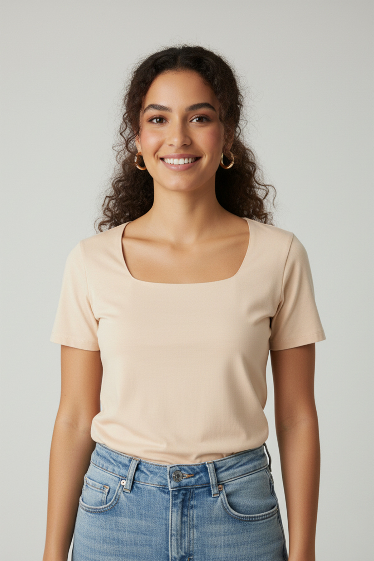 Kısa Kollu Kare Yaka Bej Modal Kadın Tişört