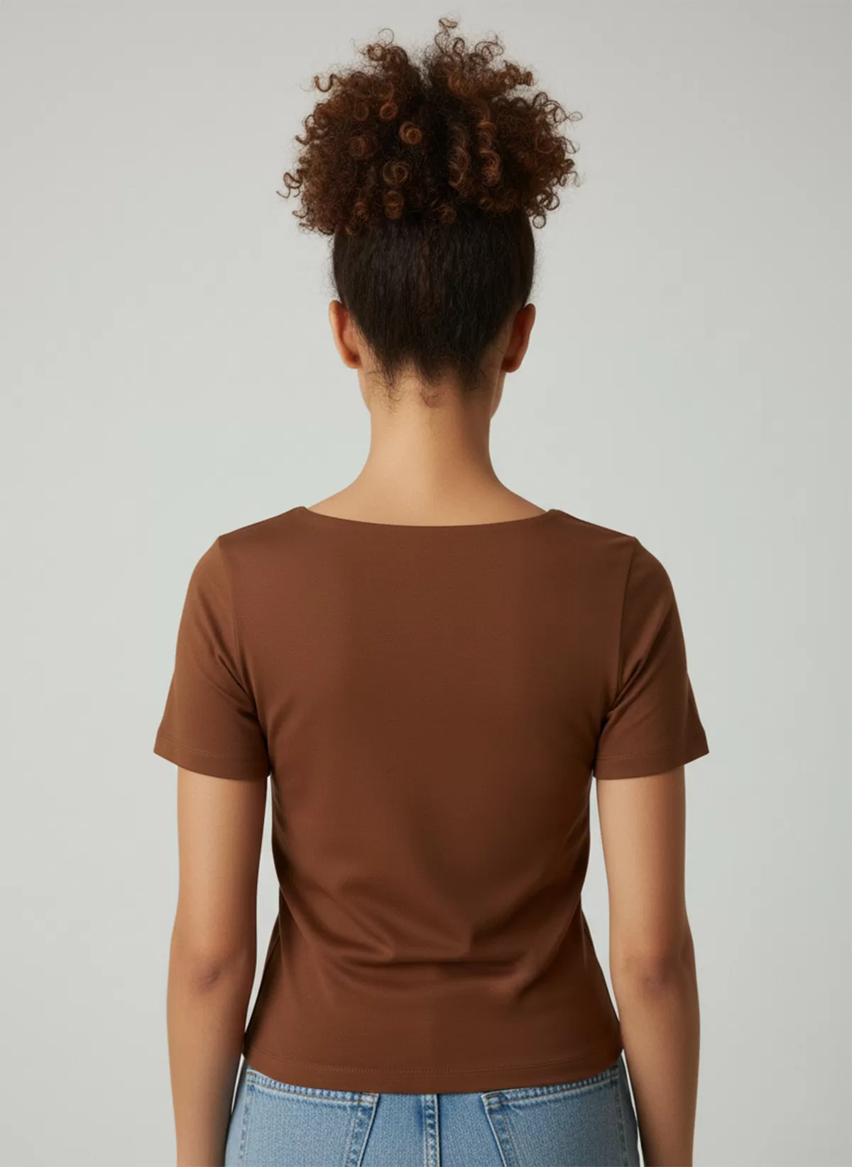 Kısa Kollu Kare Yaka Kahverengi Modal Kadın Tişört