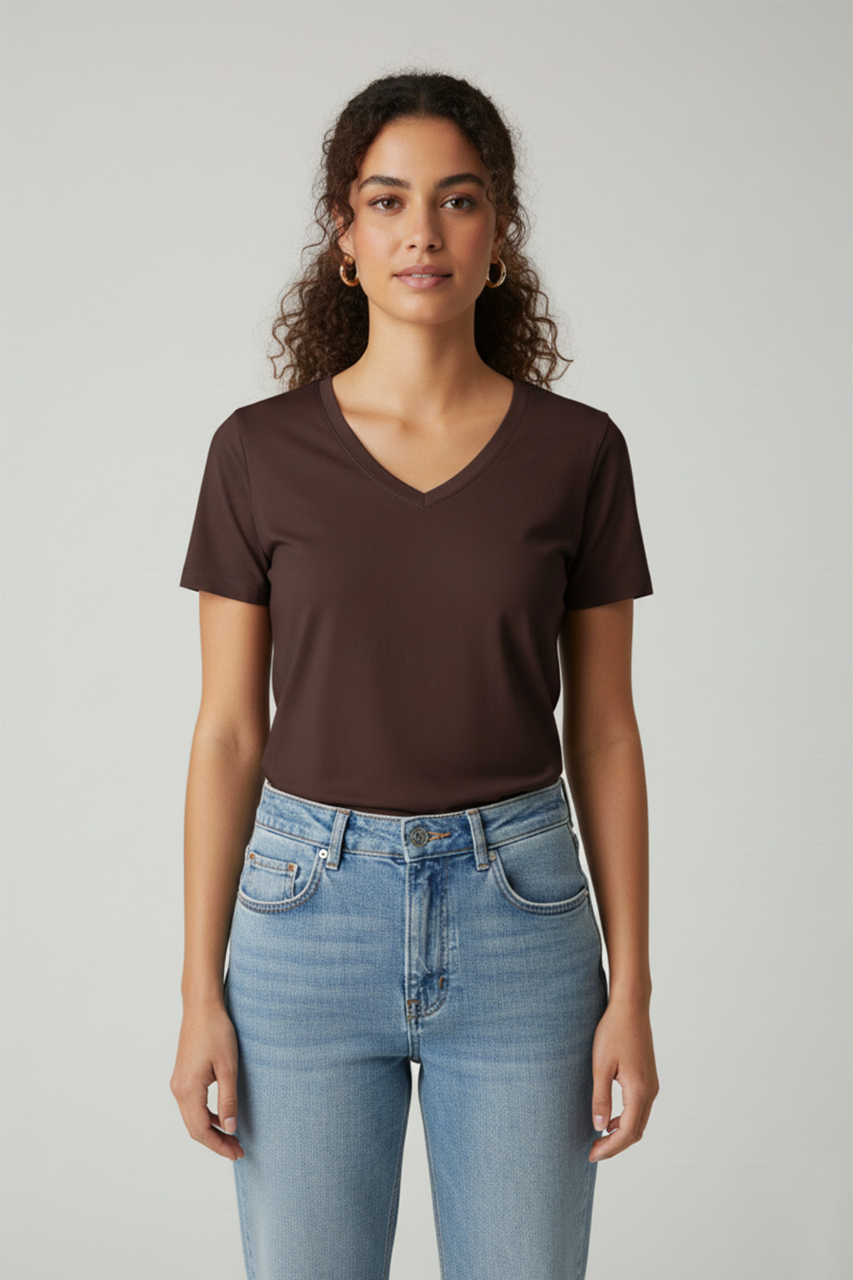 Kısa Kollu V Yaka Kahverengi Modal Kadın Tişört