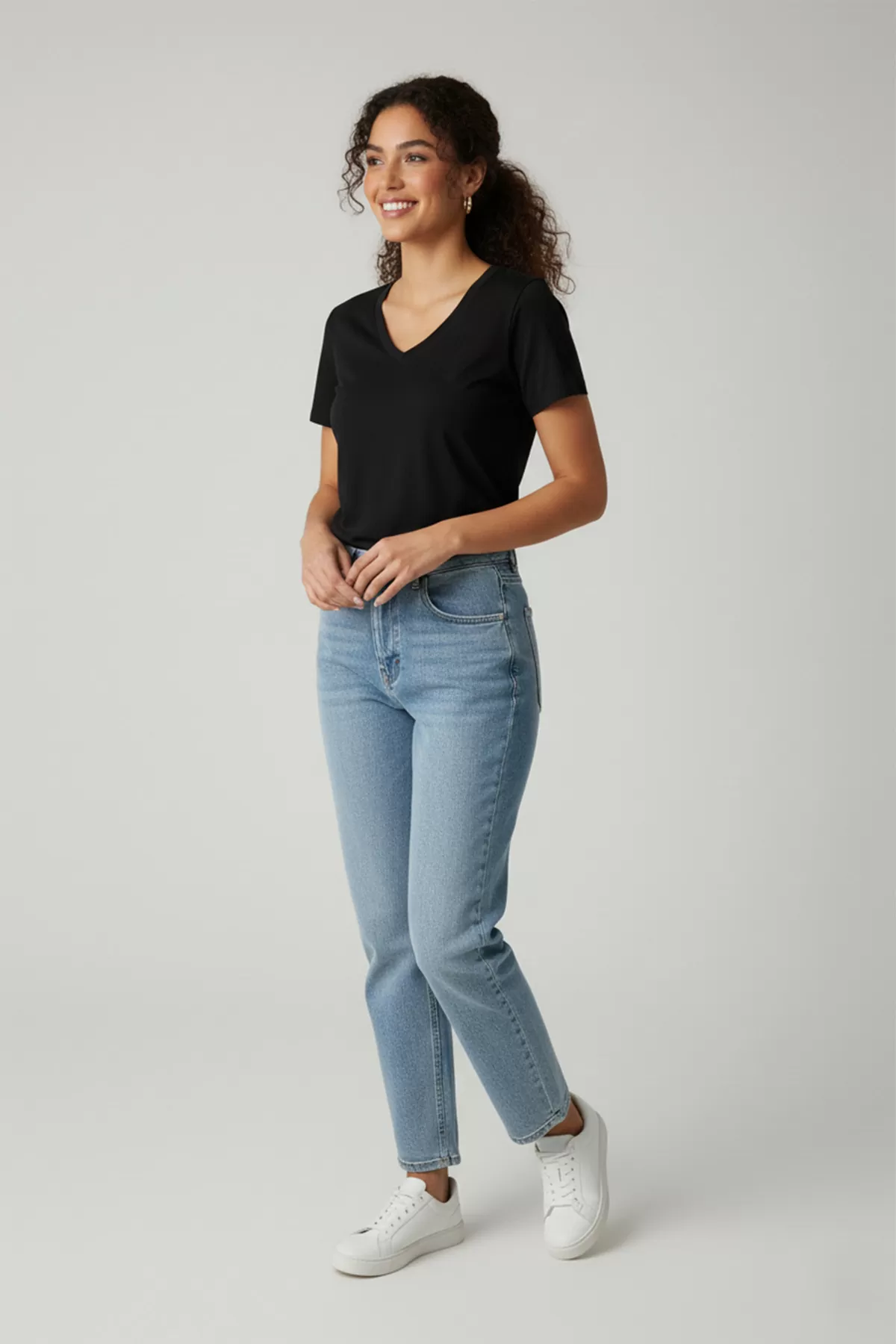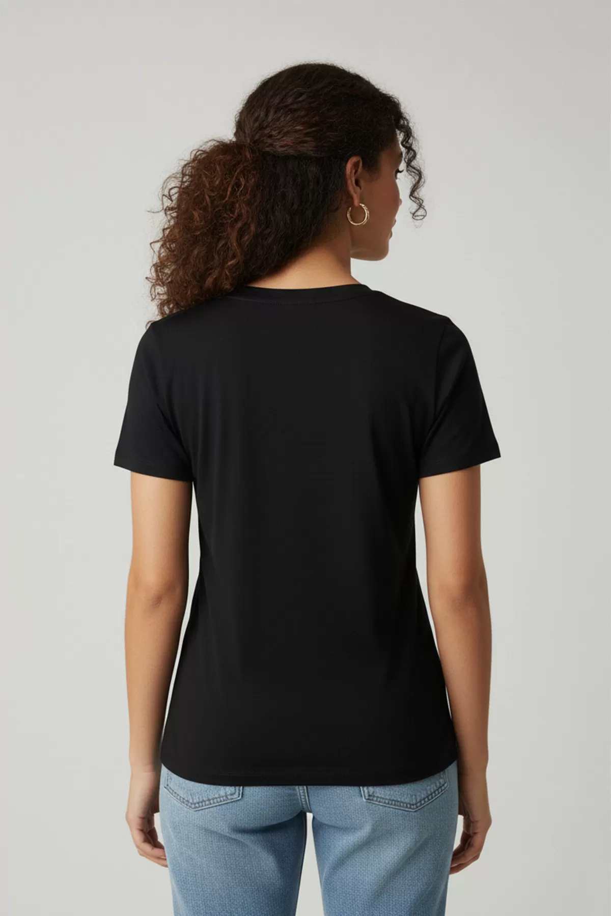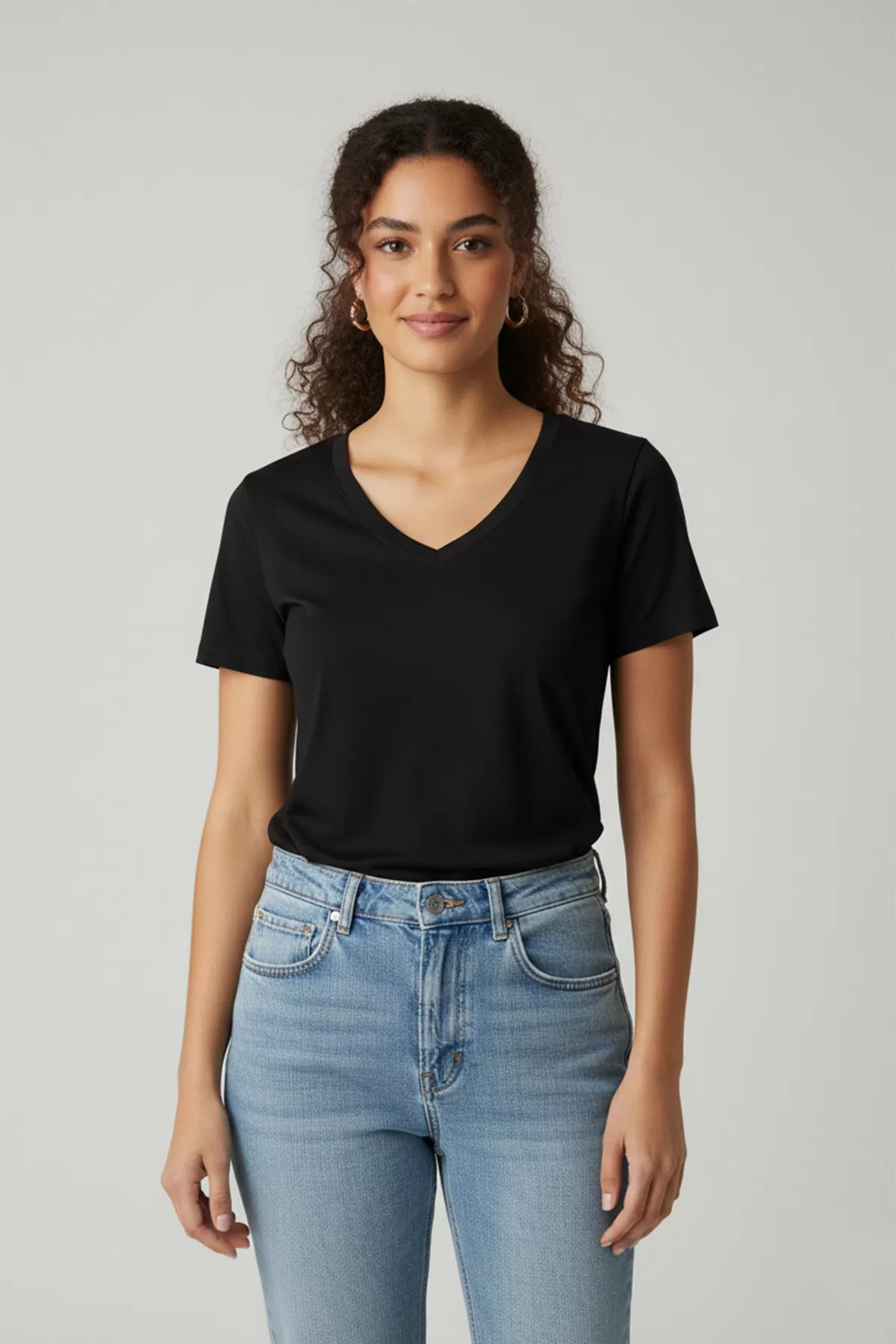 Kısa Kollu V Yaka Siyah Modal Kadın Tişört