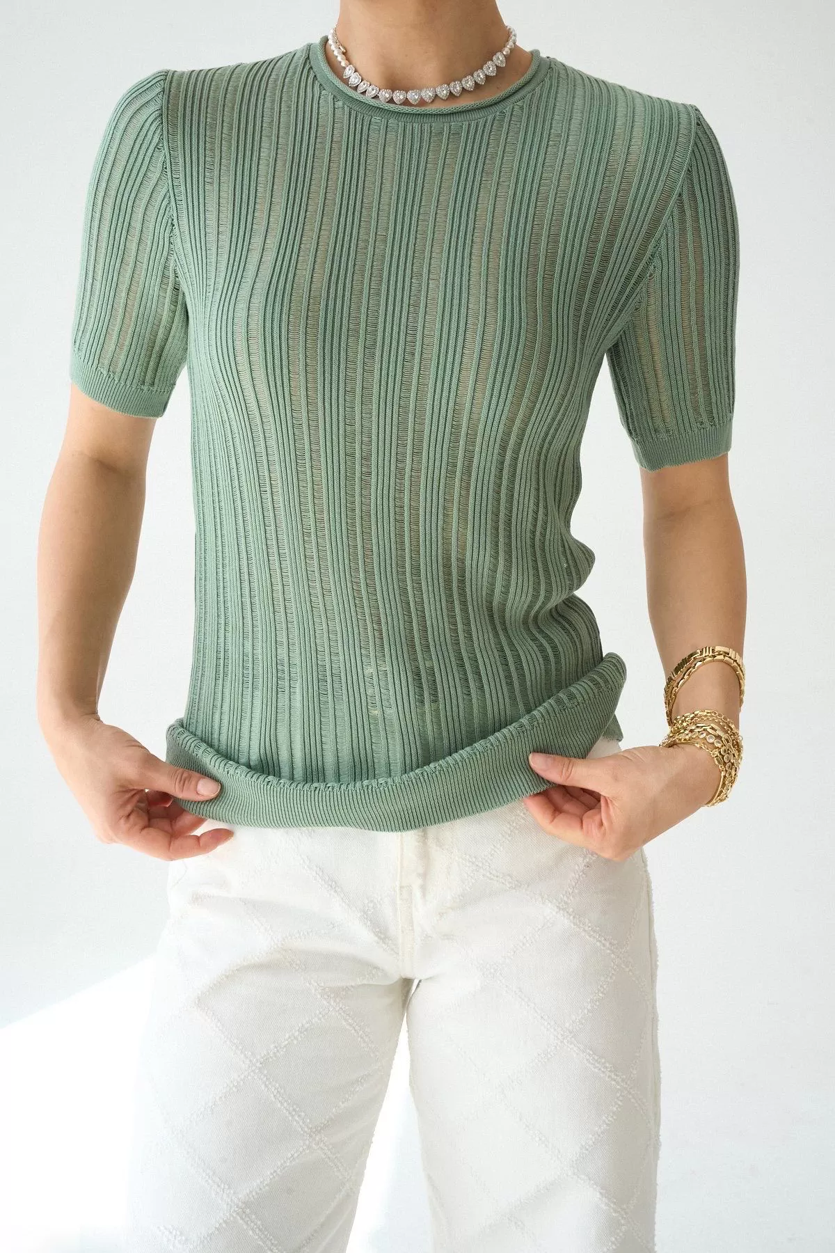 Kısa Kollu Yeşil Merserize Triko Bluz