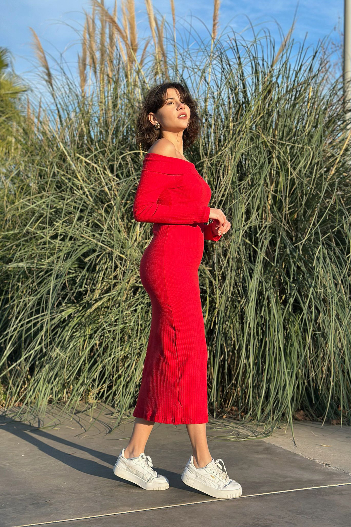 Madonna Yaka Kırmızı Kaşkorse Midi Elbise