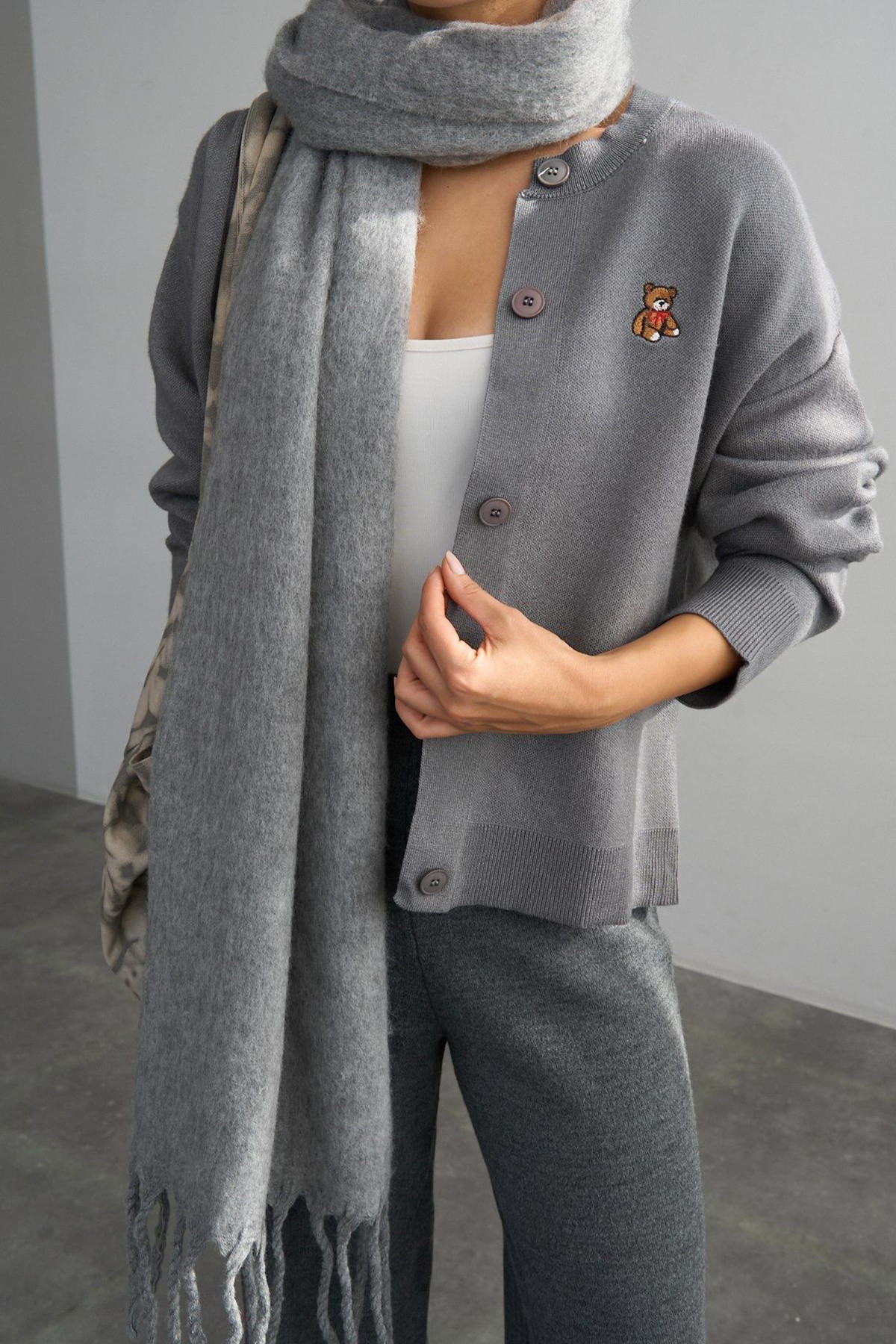 Nakış Detaylı Gri Triko Kadın Hırka