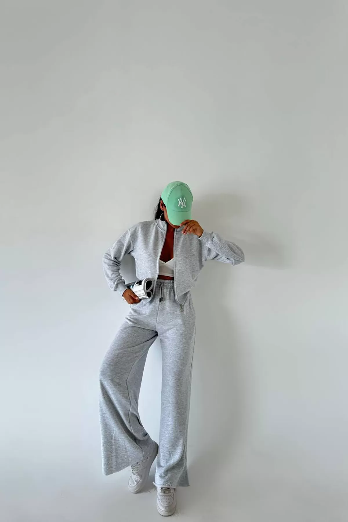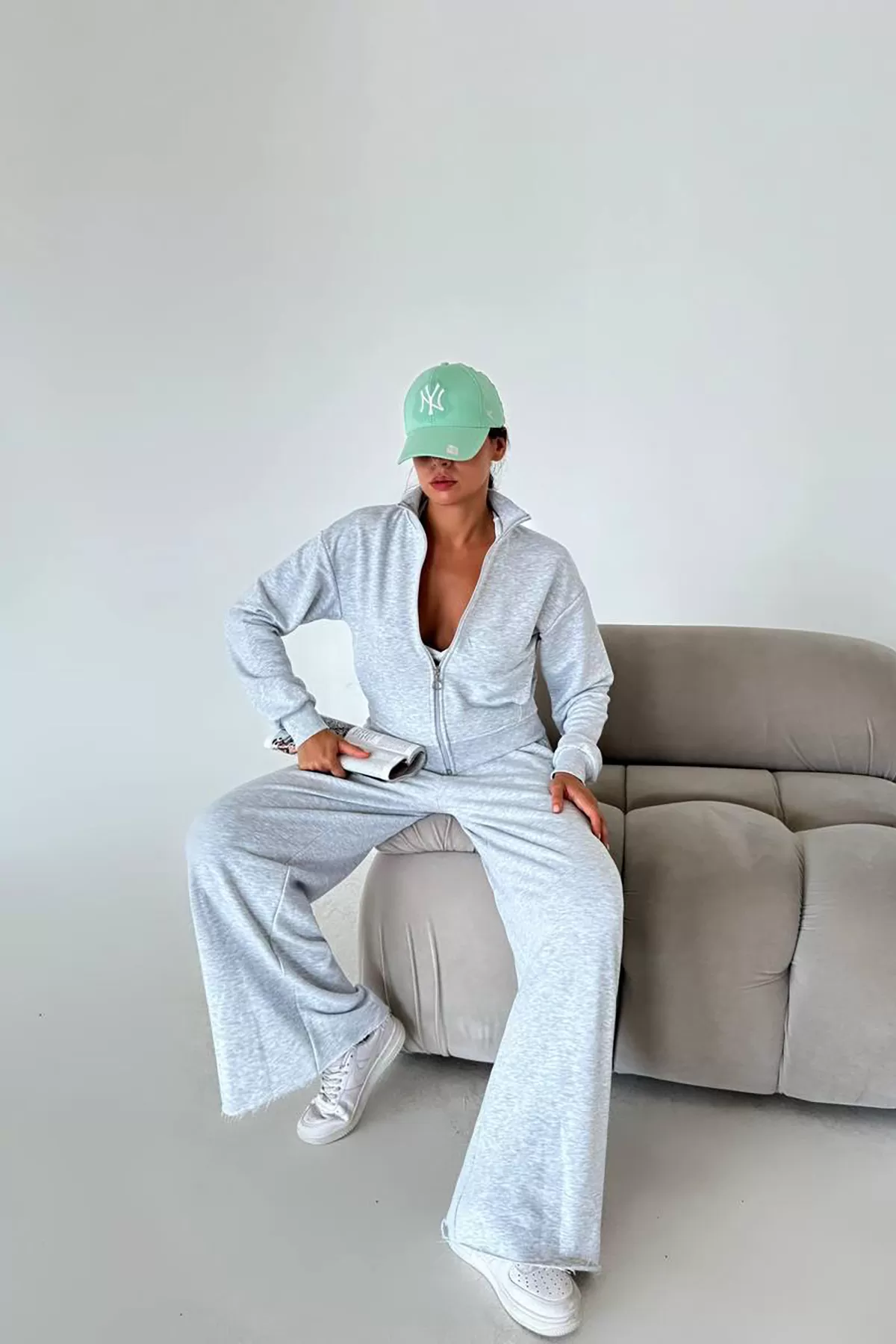 Yüzde yüz pamuklu kumaş Pamuklu Melanjlı Gri Kadın Eşofman Takımı