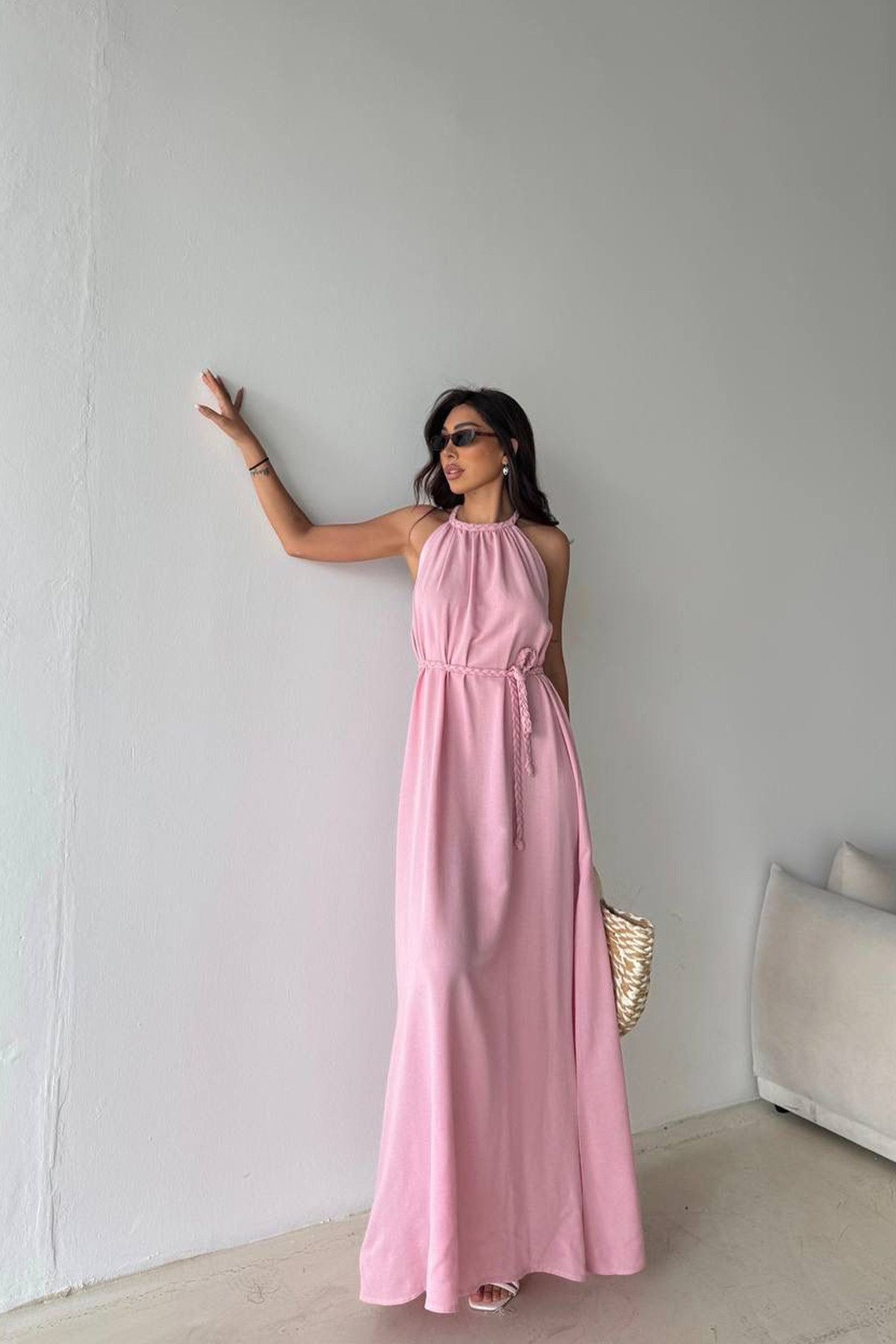 Pembe Pamuk Keten Yırtmaçlı Maksi Boy Elbise