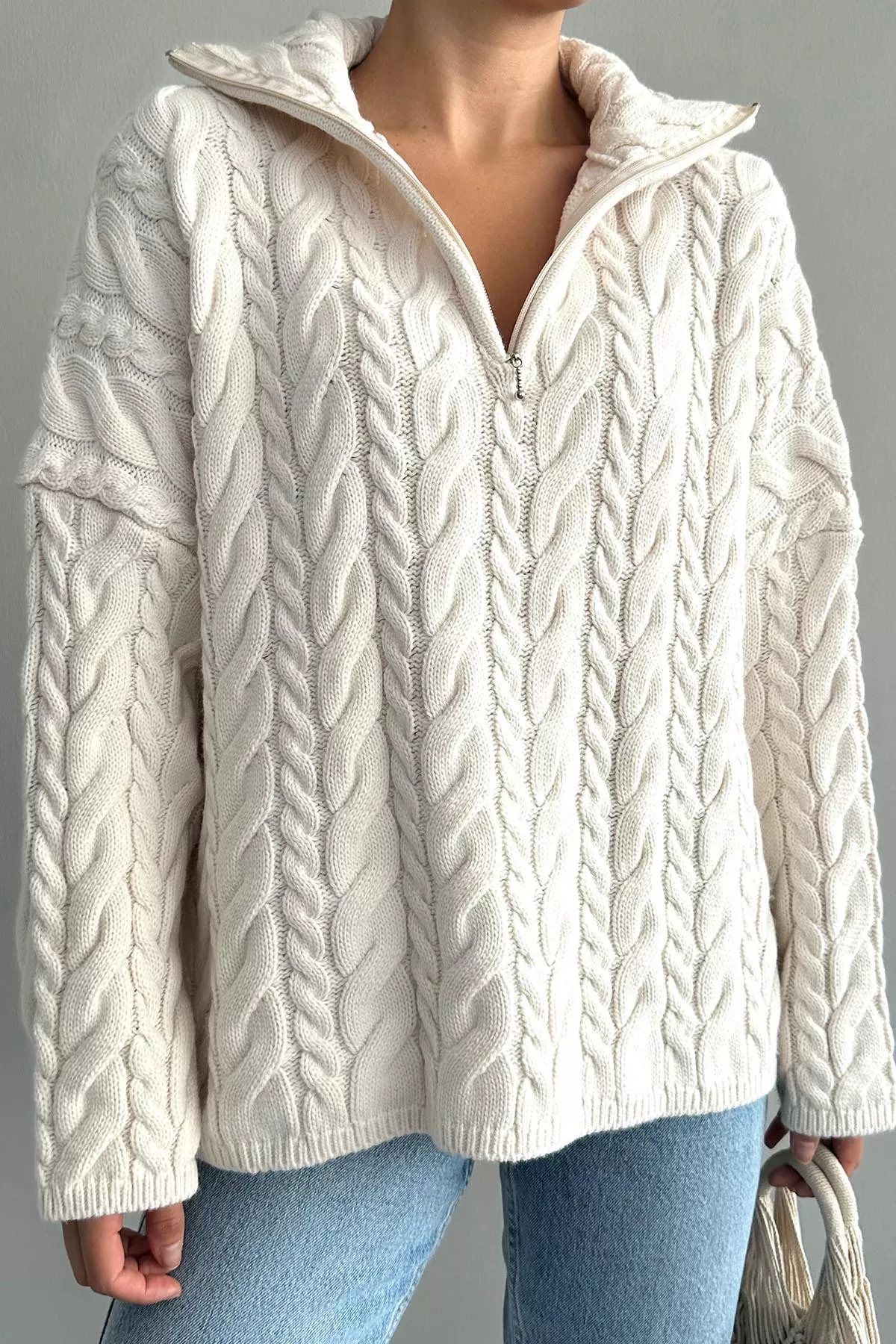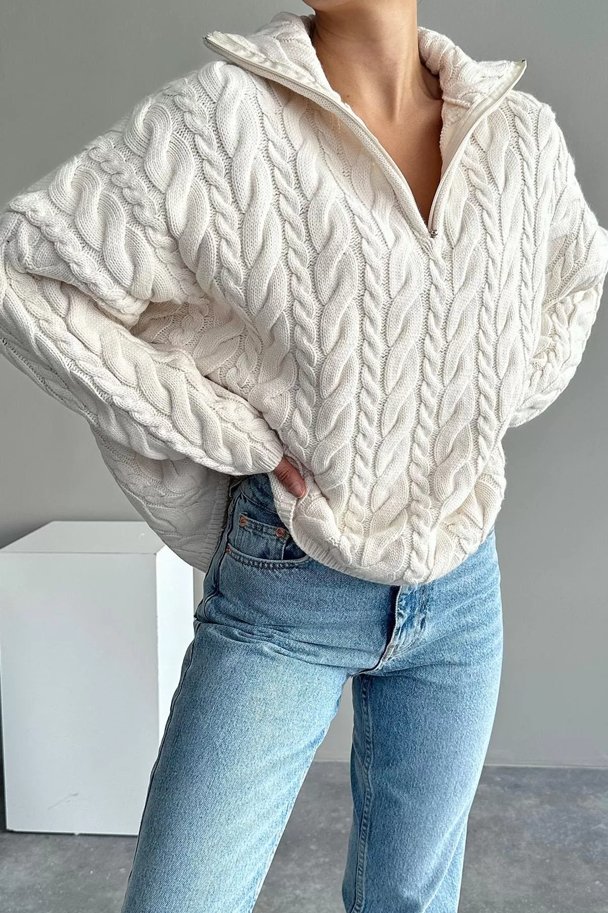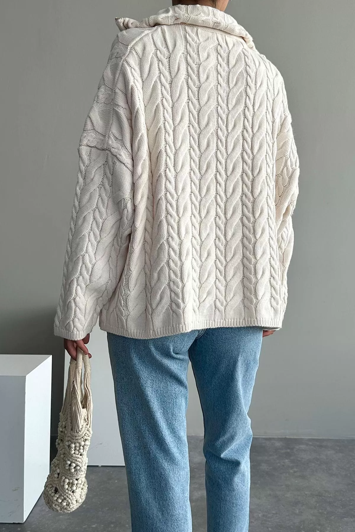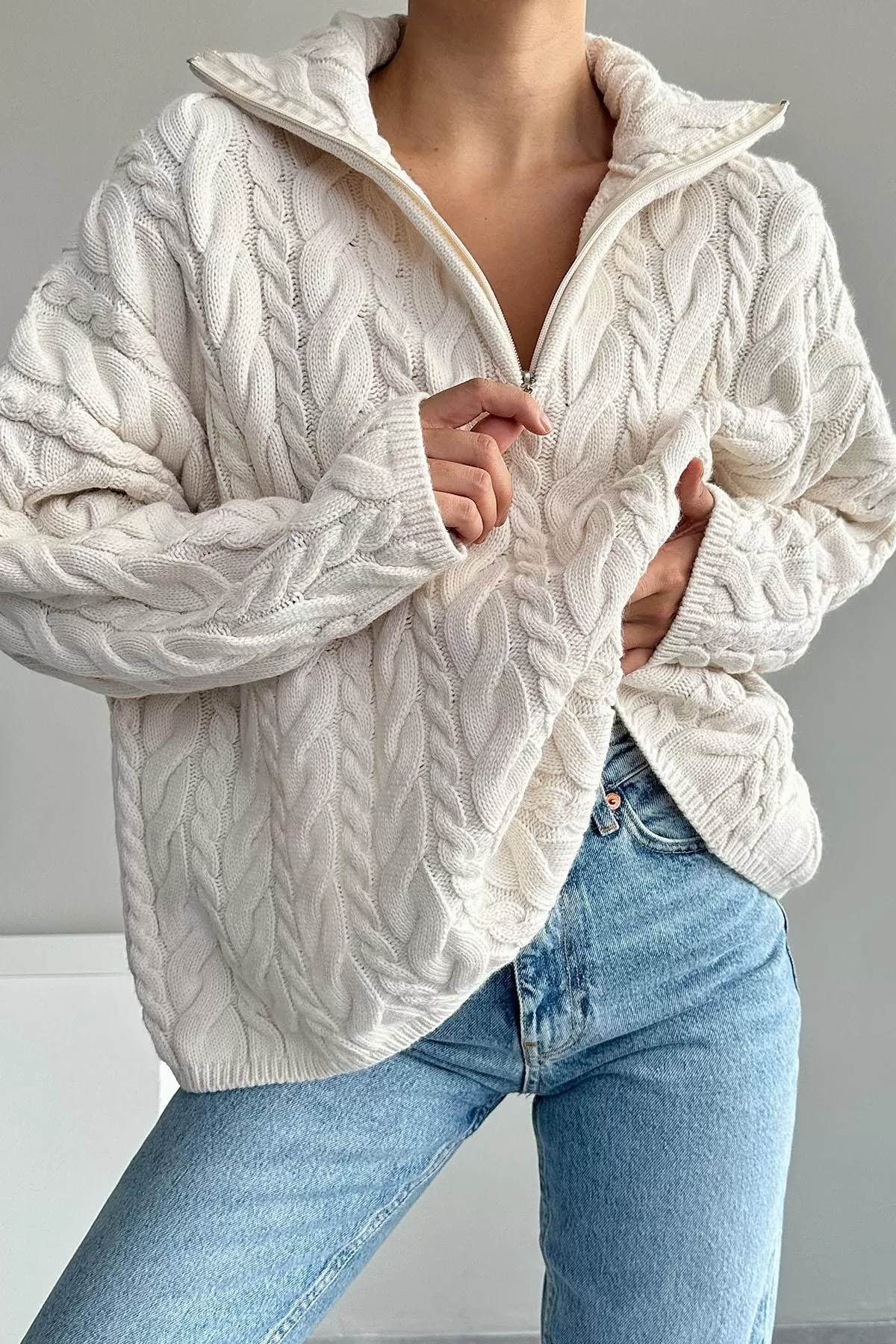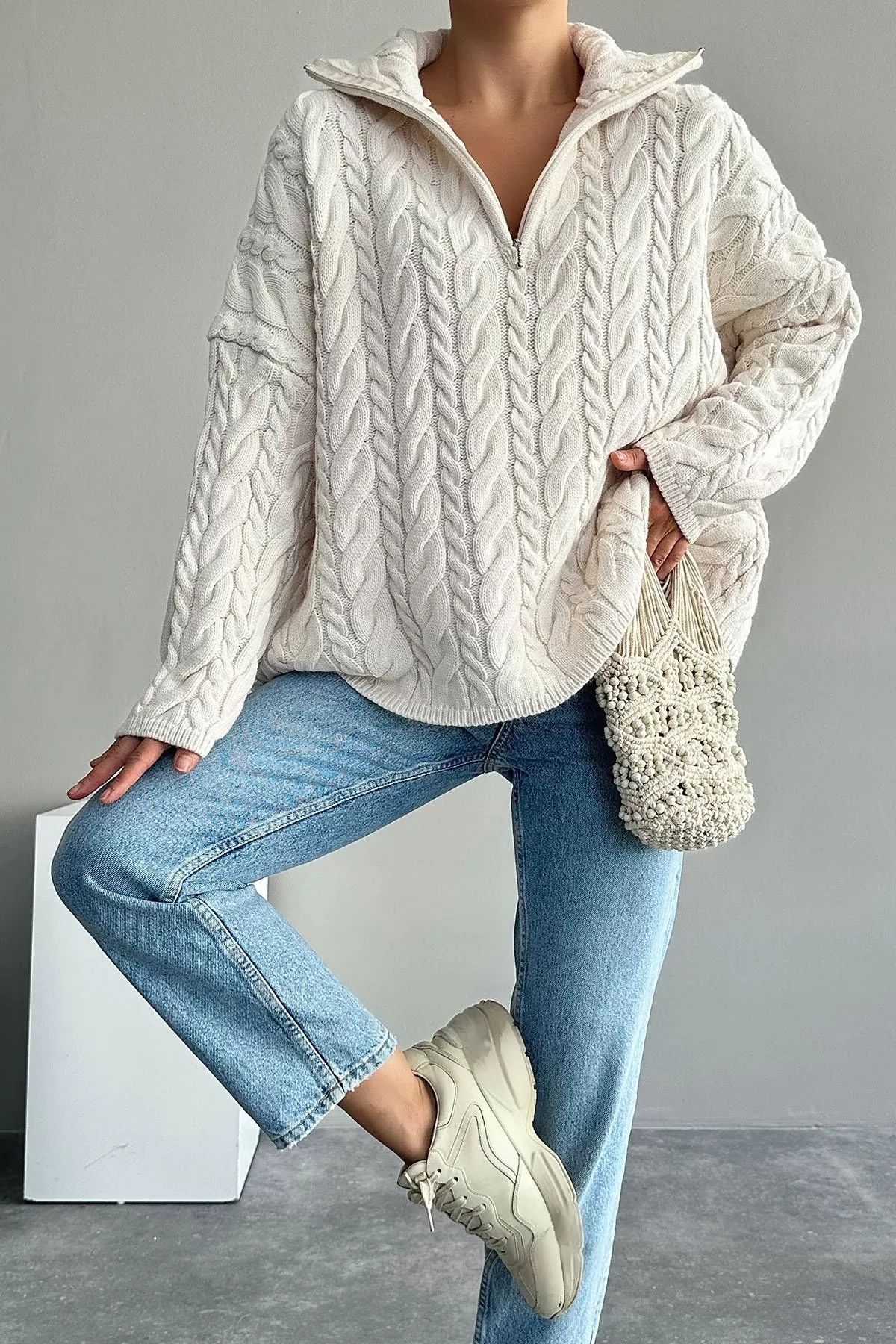 Saç Örgülü Fermuarlı Krem Triko Kadın Kazak