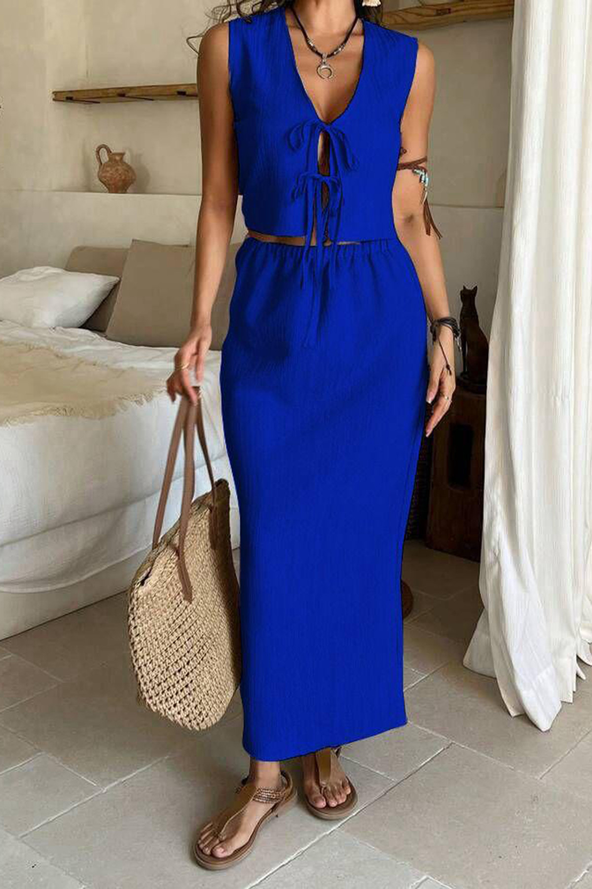 Saks Mavi İp Bağlamalı Bluz Etek Alt Üst Takım
