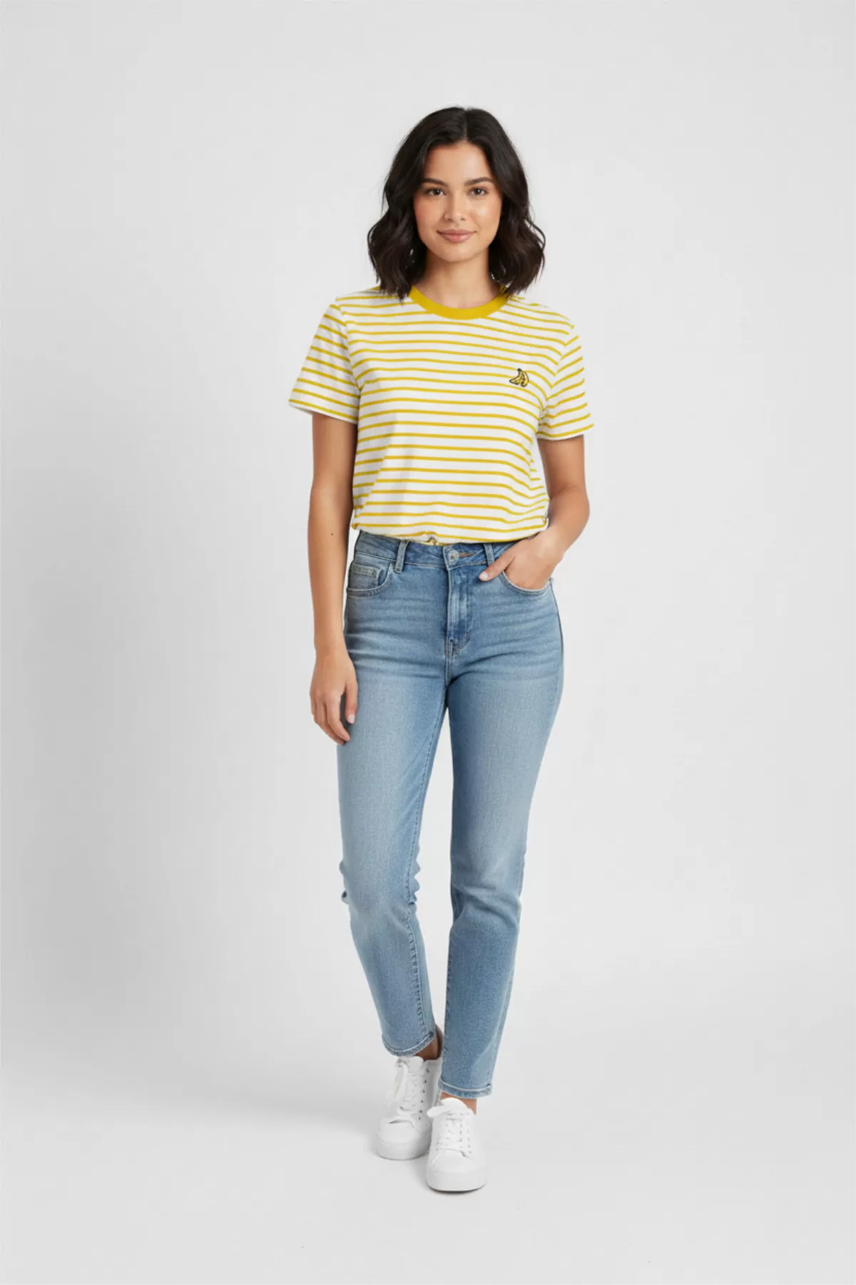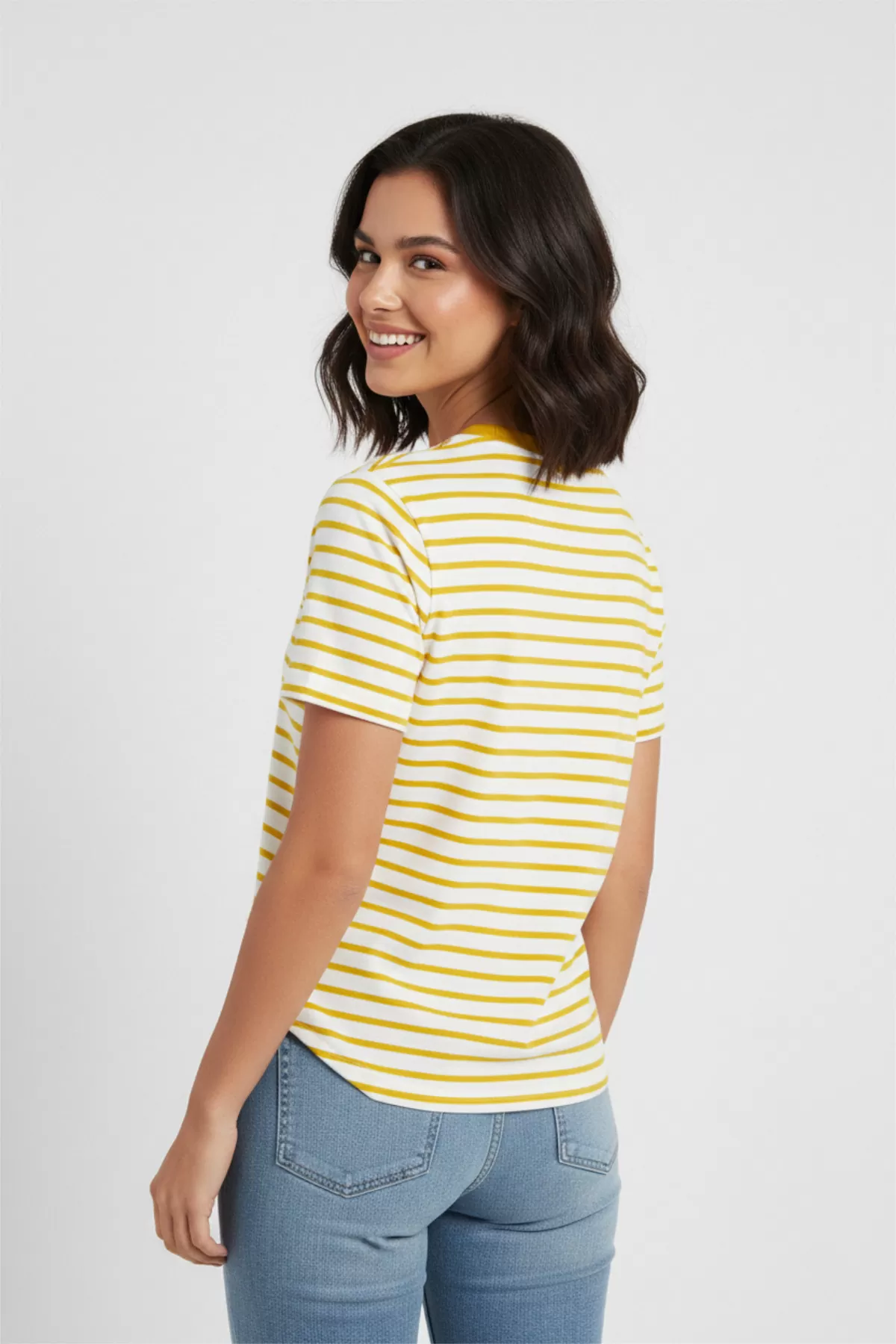 Facebook Pixel Sarı Beyaz Çizgili Pamuklu Nakışlı Kadın Tişört, Fiyatı 384.97 TL | Nare Giyim