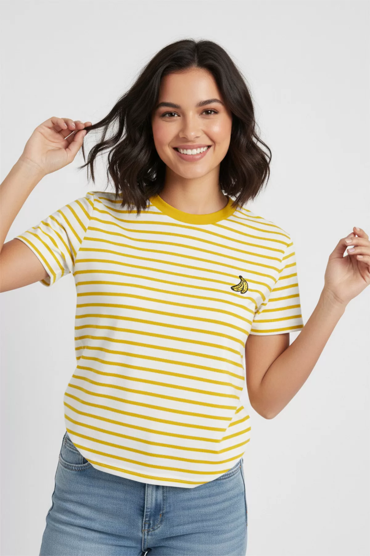 Yüzde yüz pamuklu kumaş Sarı Beyaz Çizgili Pamuklu Nakışlı Kadın Tişört