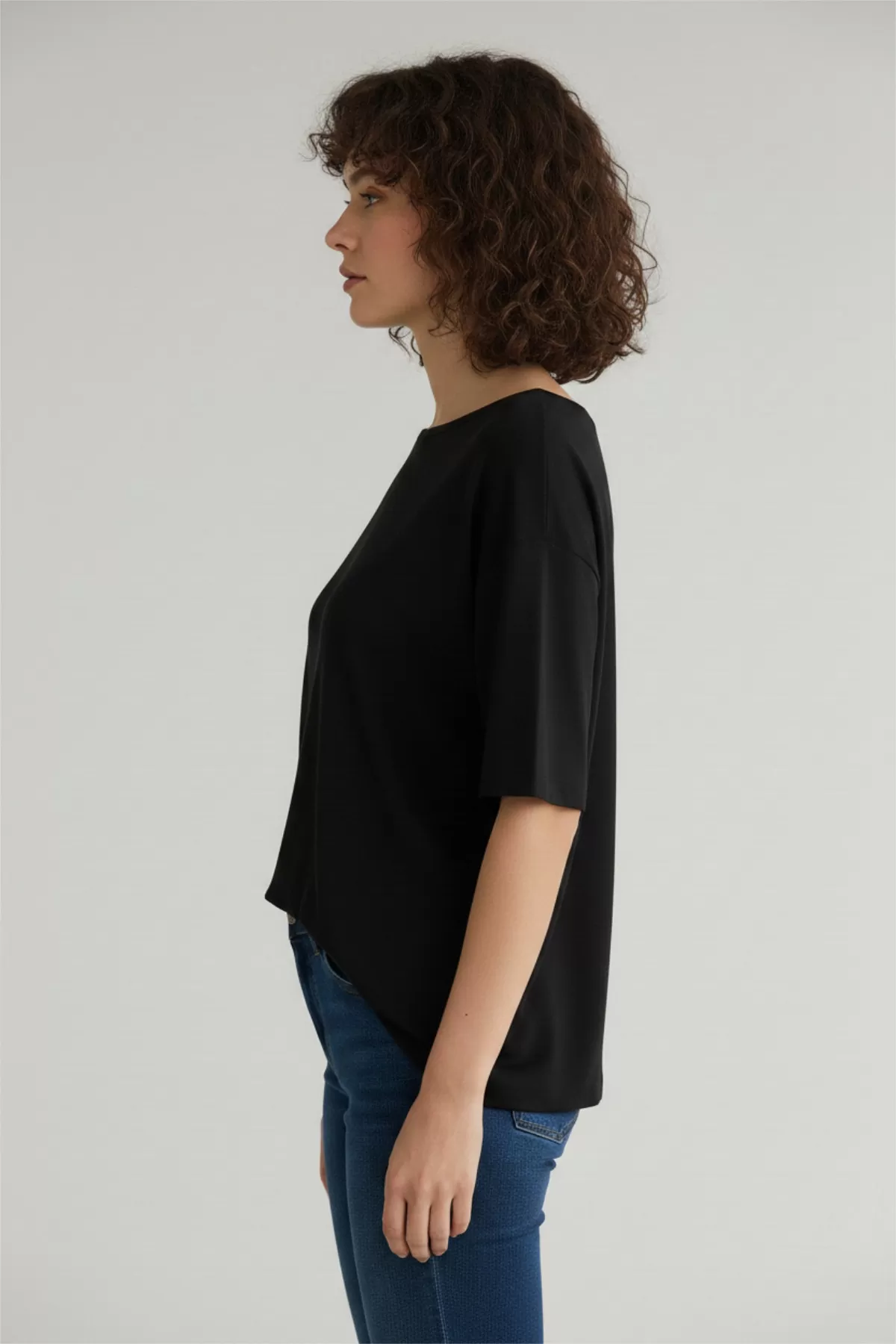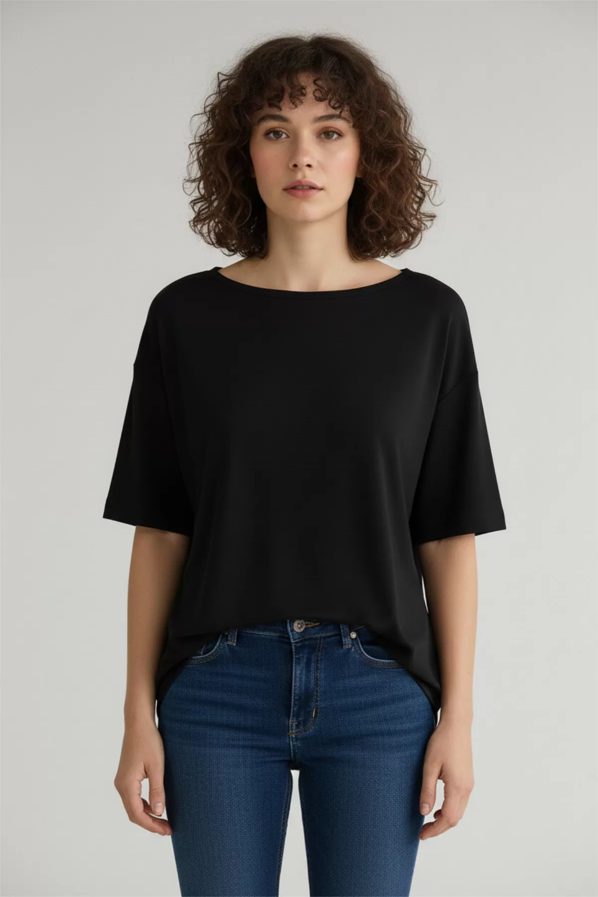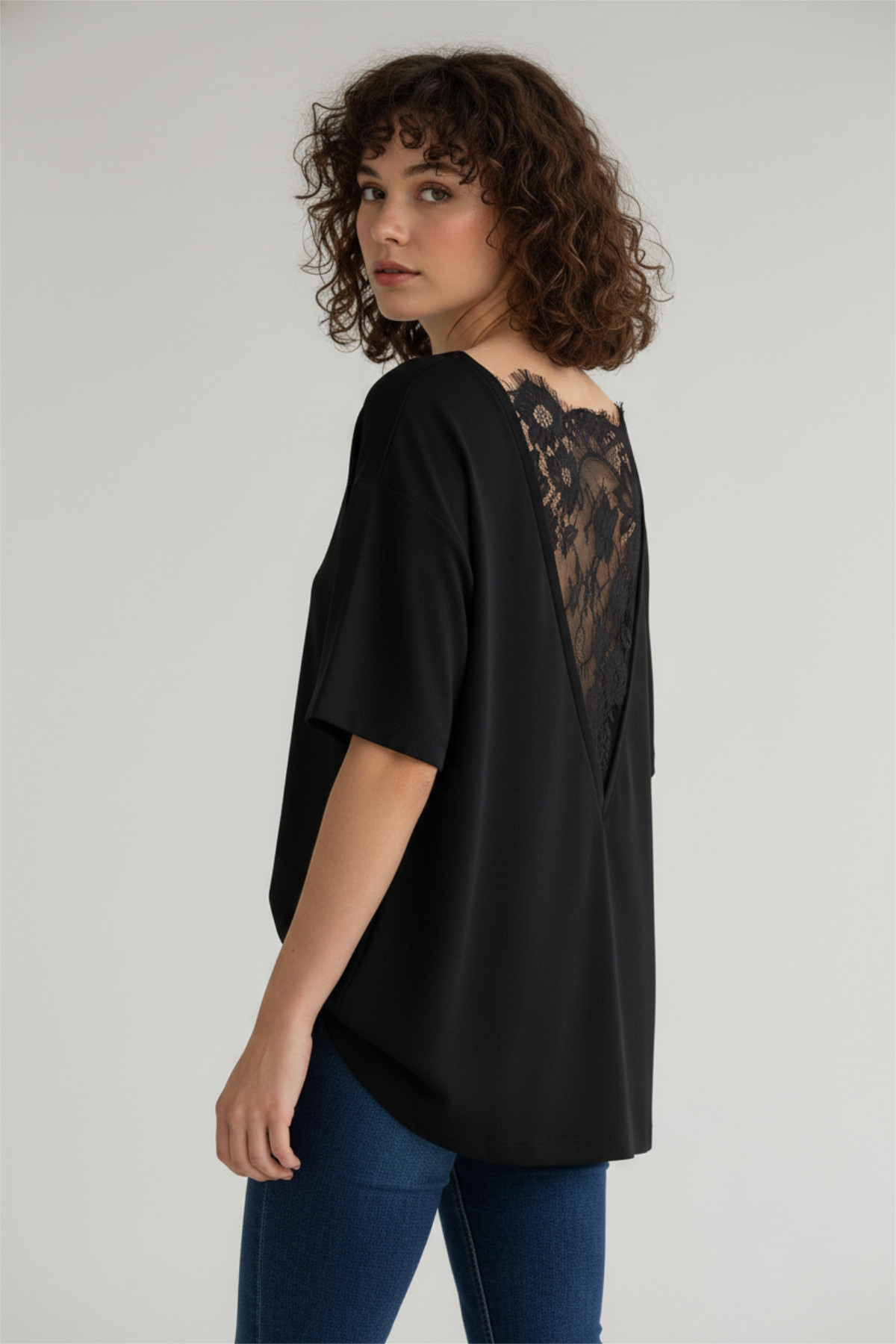 Sırtı Dantel Detaylı Siyah Oversize Kadın Tişört