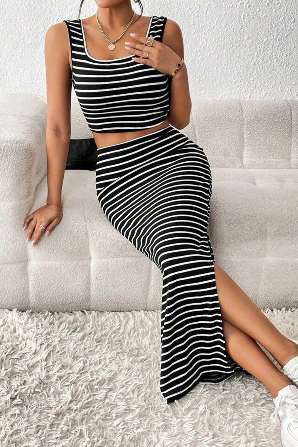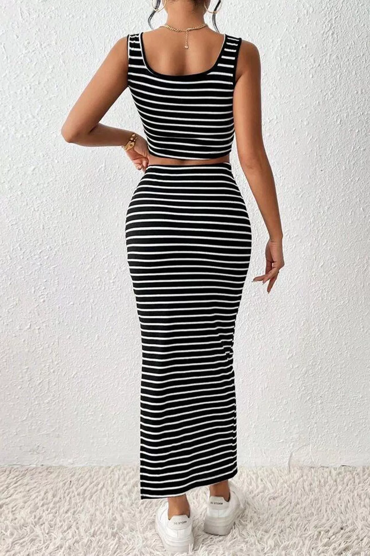 Siyah Beyaz Çizgili Etek Bluz Alt Üst Takım Siyah Beyaz Çizgili Etek Bluz Alt Üst Takım