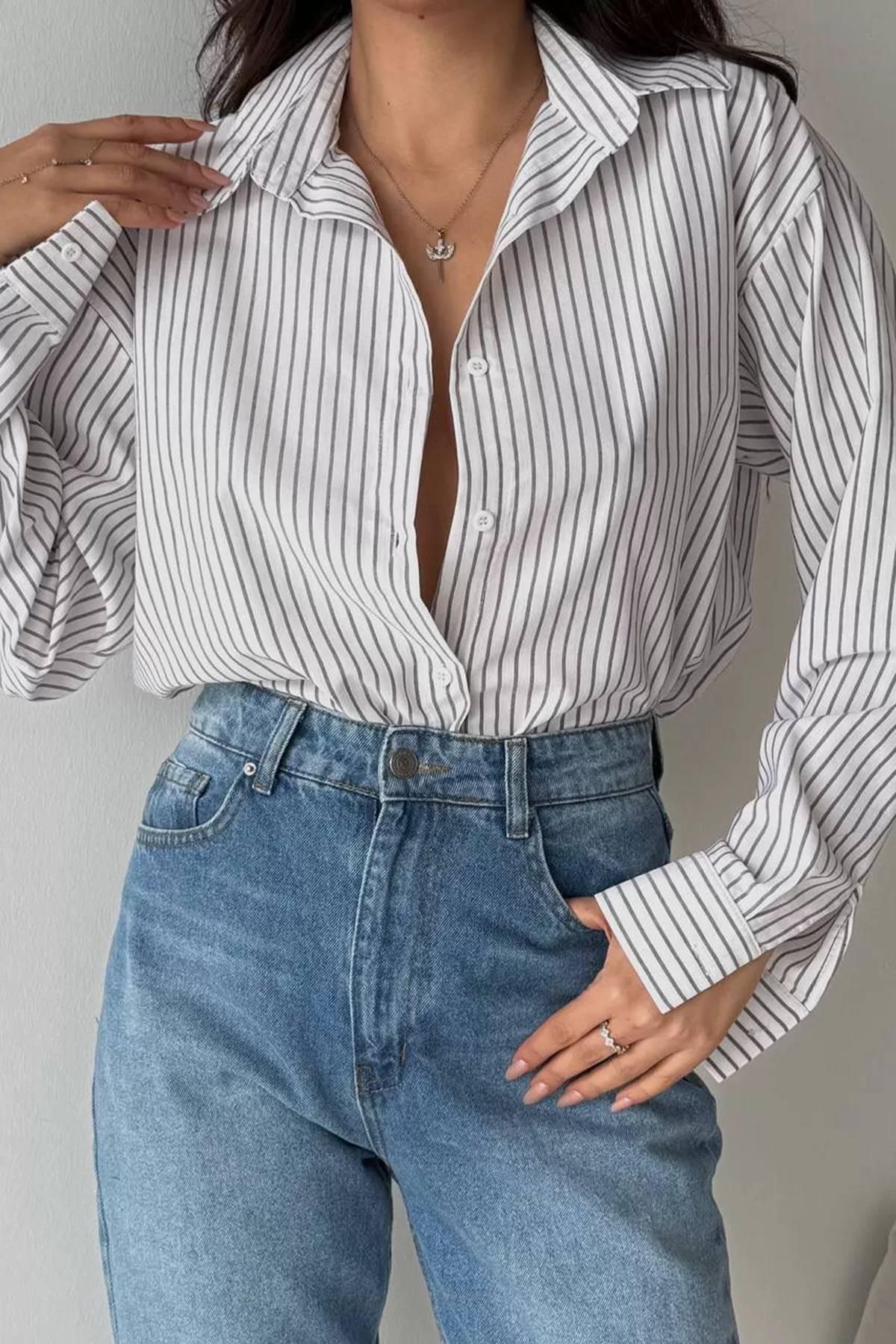 Siyah Beyaz Çizgili Oversize Poplin Kadın Gömlek